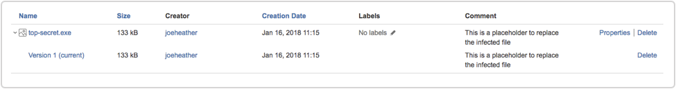 - A placeholder would be uploaded in place of the infected file. This is to ensure the content in the Confluence page is not affected by the deleted file