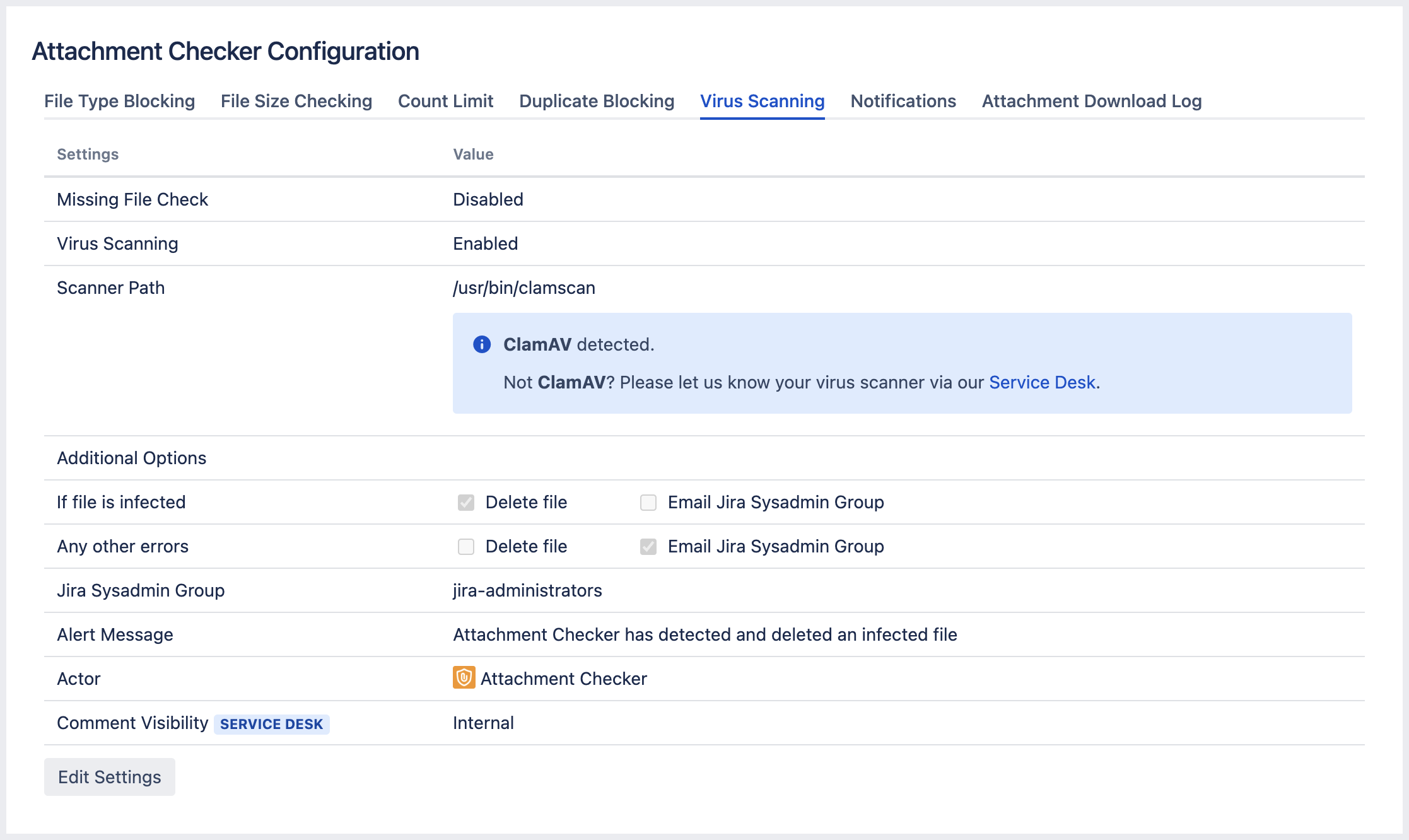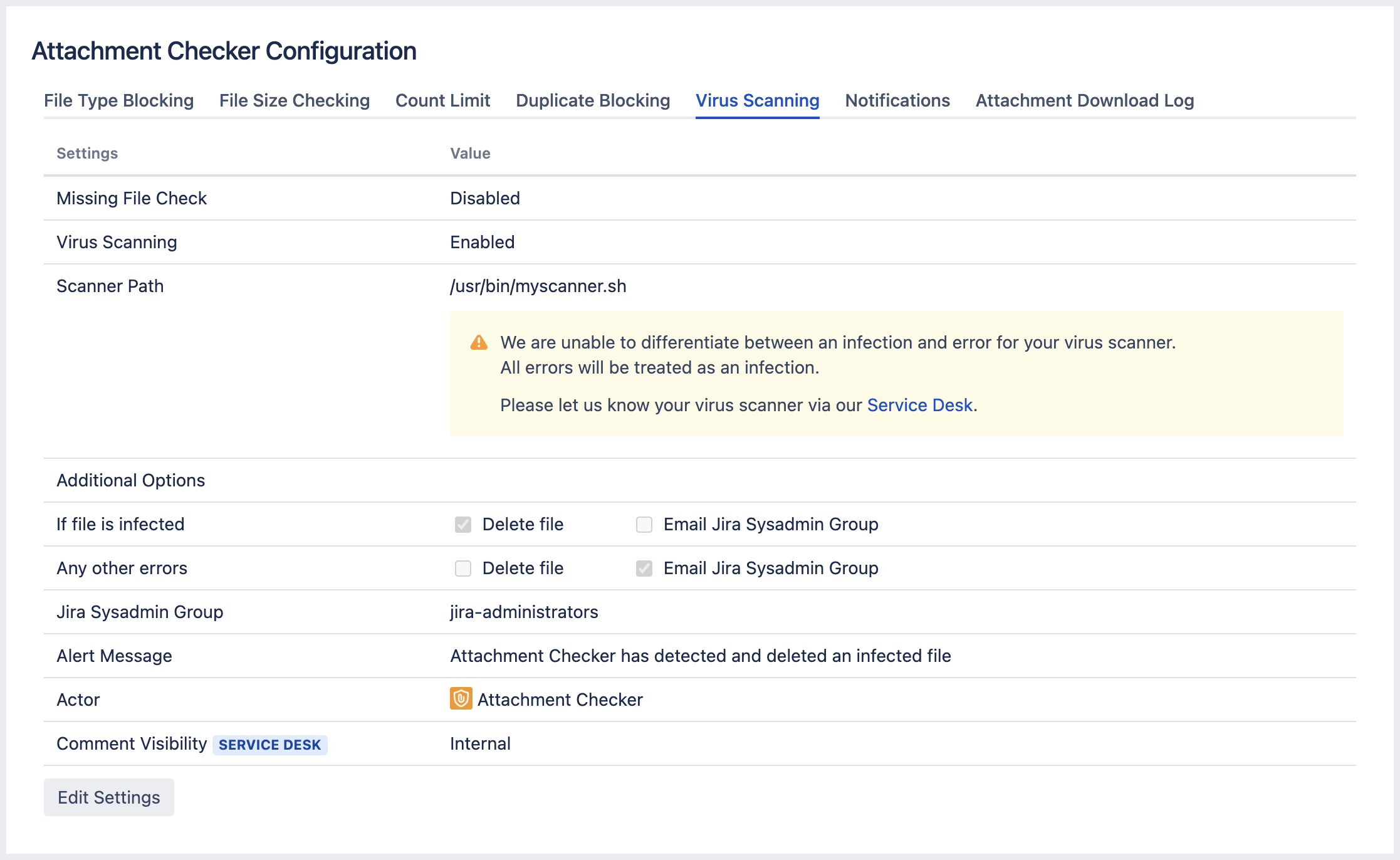 When an infection or error occurs, a comment will always be added to the issue. An email will also be sent to the Jira Sysadmin Group if configured.
