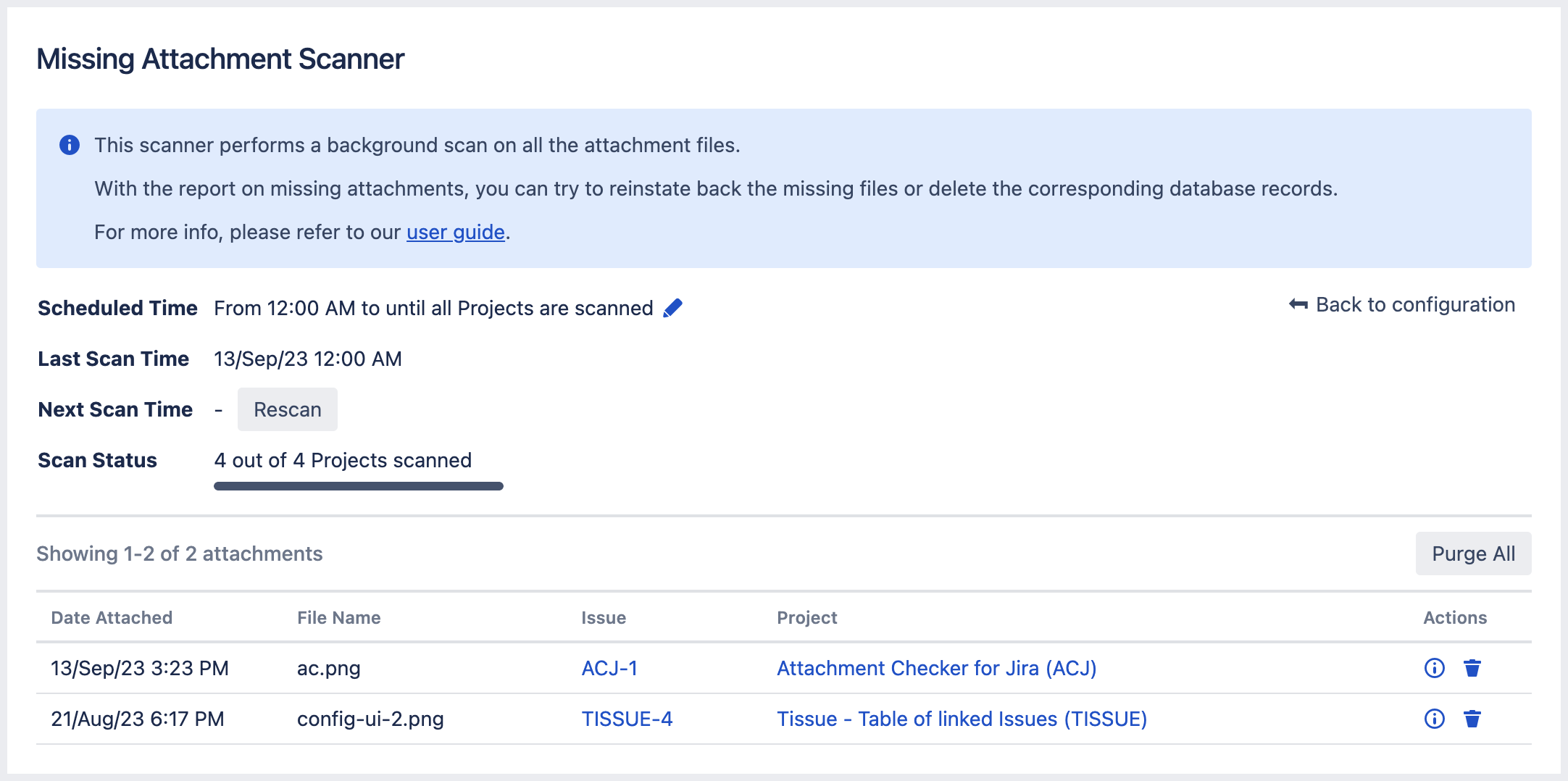 Admins can now scan for missing attachments which helps to facilitate data recovery, fix broken attachments in the Jira issues and more.