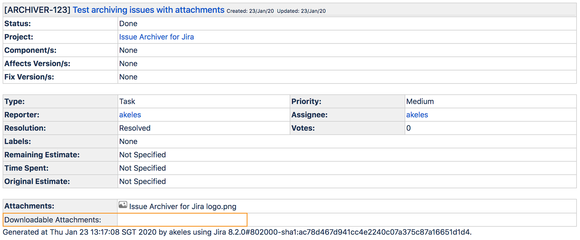 If the project key has previously been changed, the Attachments in the archived issues will be listed but Downloadable Attachments will be empty.