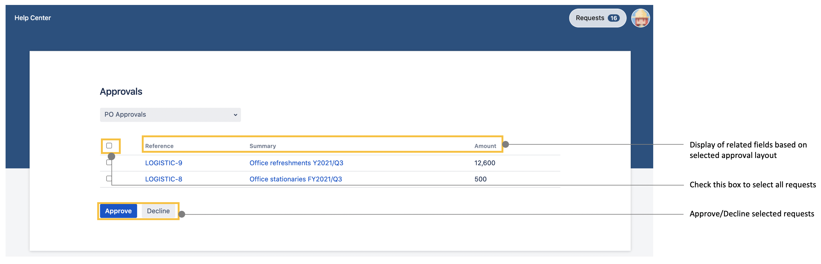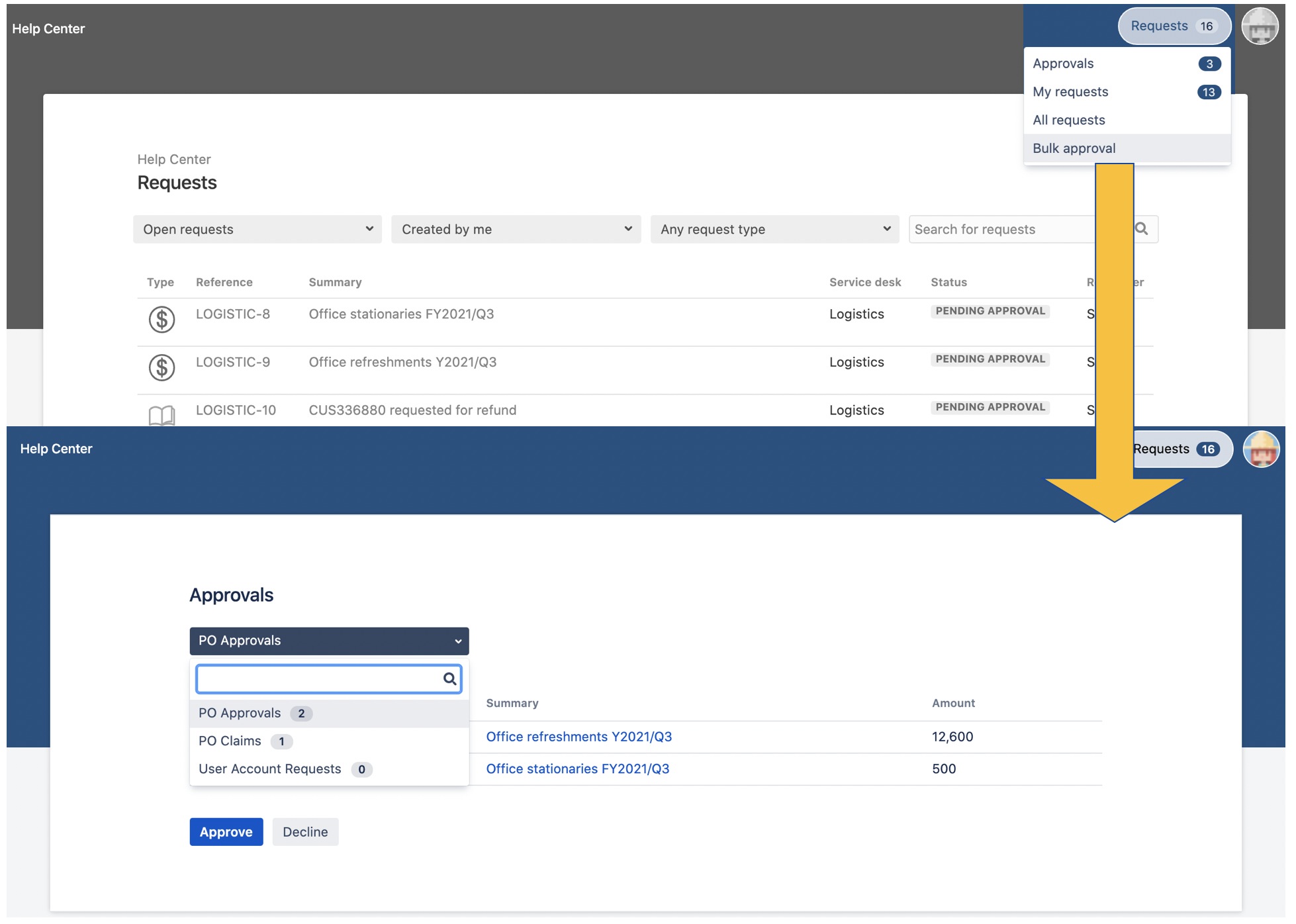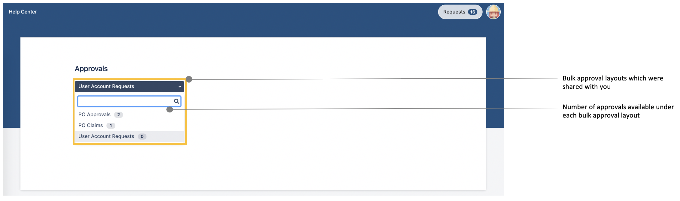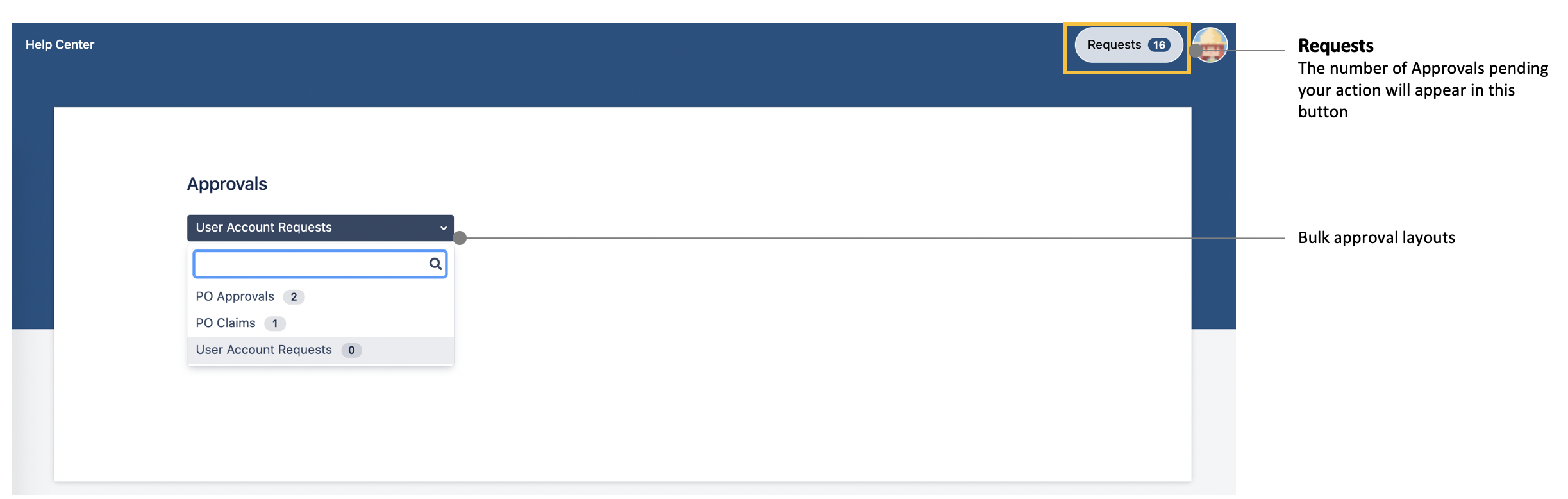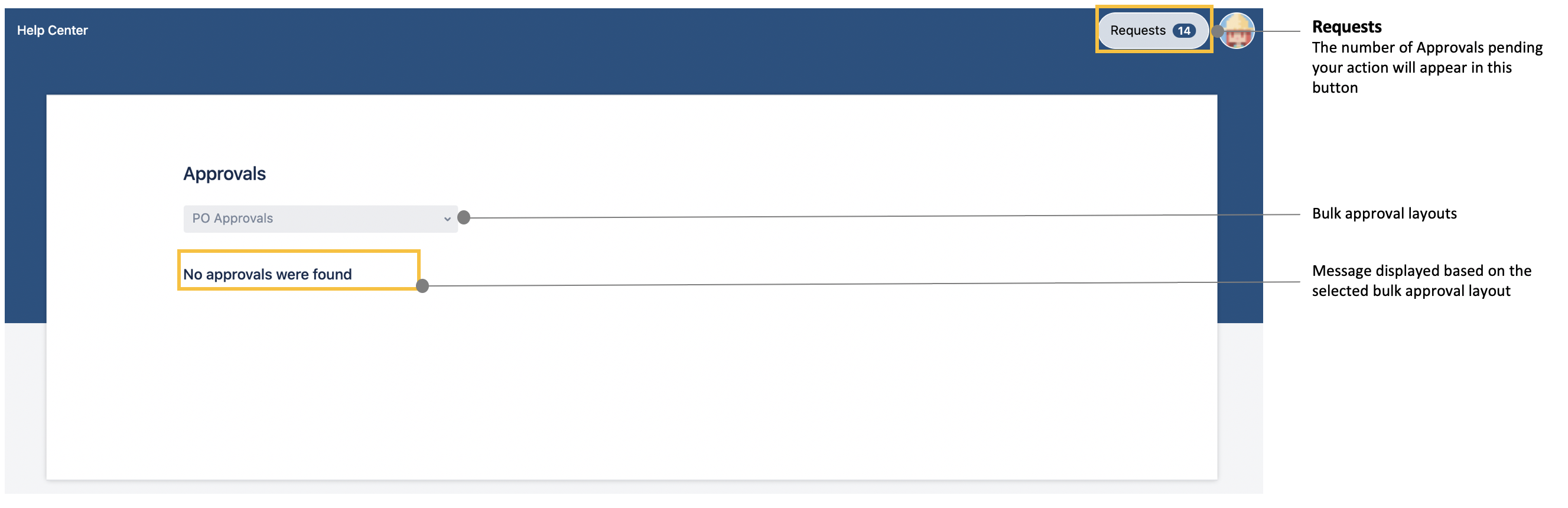 You can view the Bulk approval landing page under Requests > Bulk approval