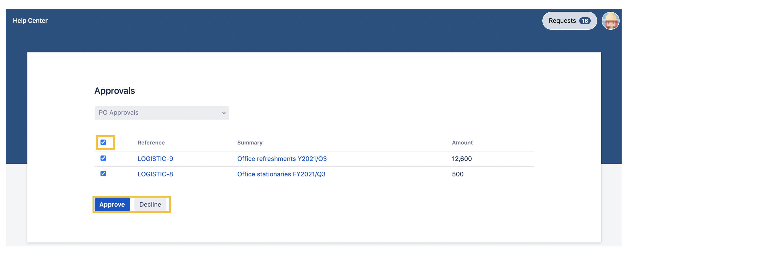 Select at least 1 request by ticking on the checkbox before clicking on the Approve or Decline button