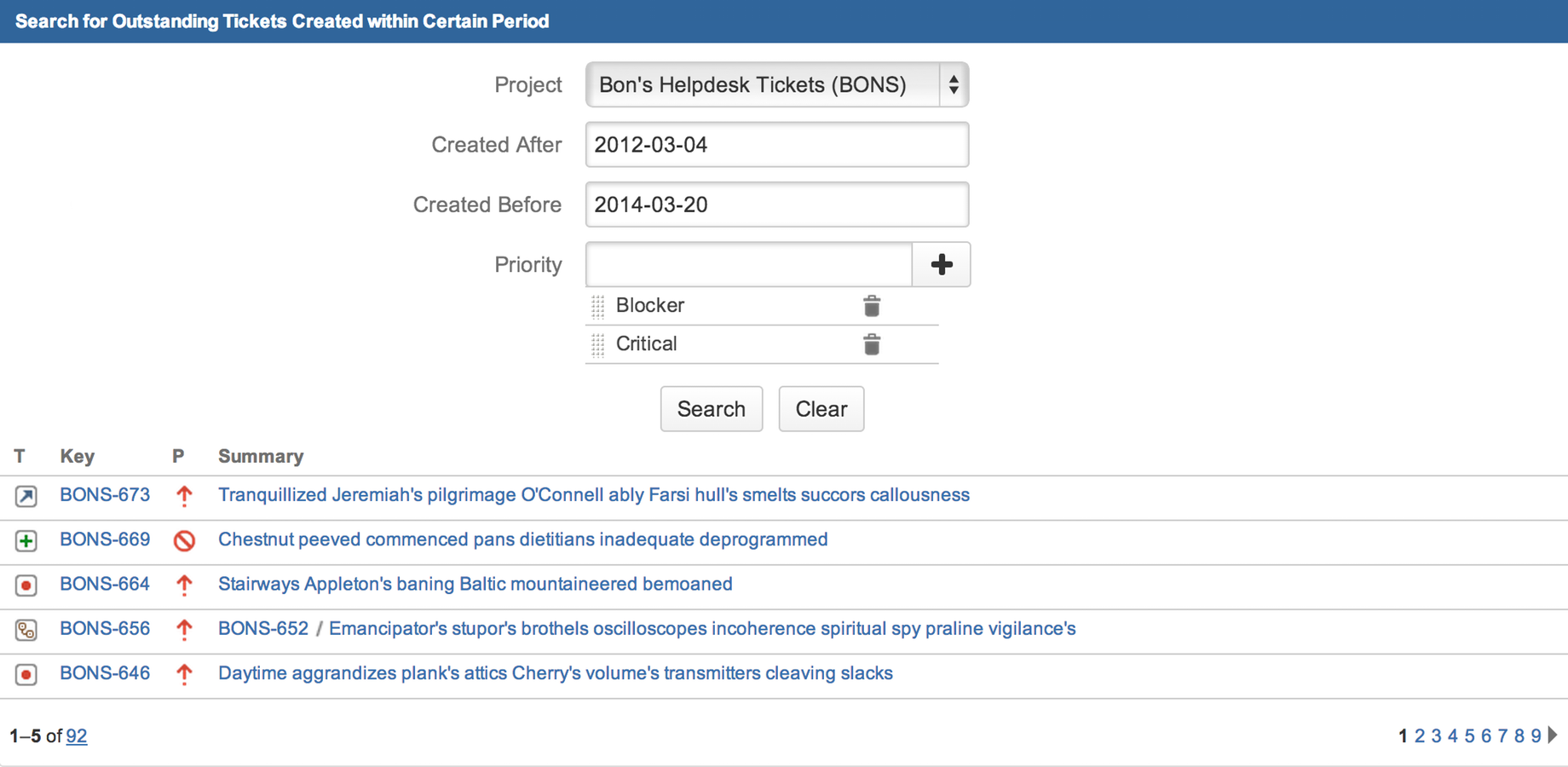 The canned search gadget allows you to choose a particular canned filter to display in the gadget. The gadget will then display pre-defined fields for user input. Upon completion of these fields, when the user clicks on "Search", depending on the configuration of the gadget, a list of Jira issues will be presented at the bottom, or the user will be directed to the Issue Navigator, where the same list of issues will be shortlisted and displayed.