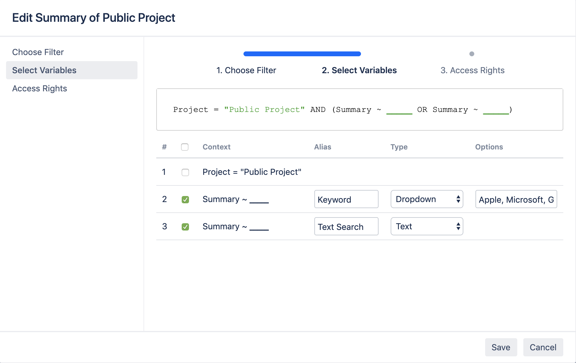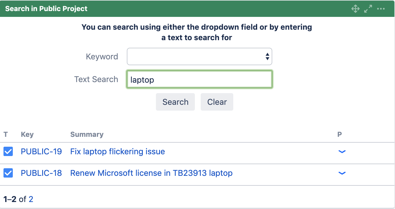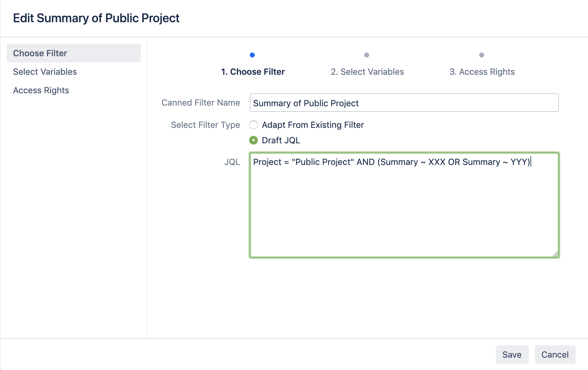 The Canned Filter adapts an existing Jira filter and allows you to select which fields to be displayed for searching and which fields to stay fixed