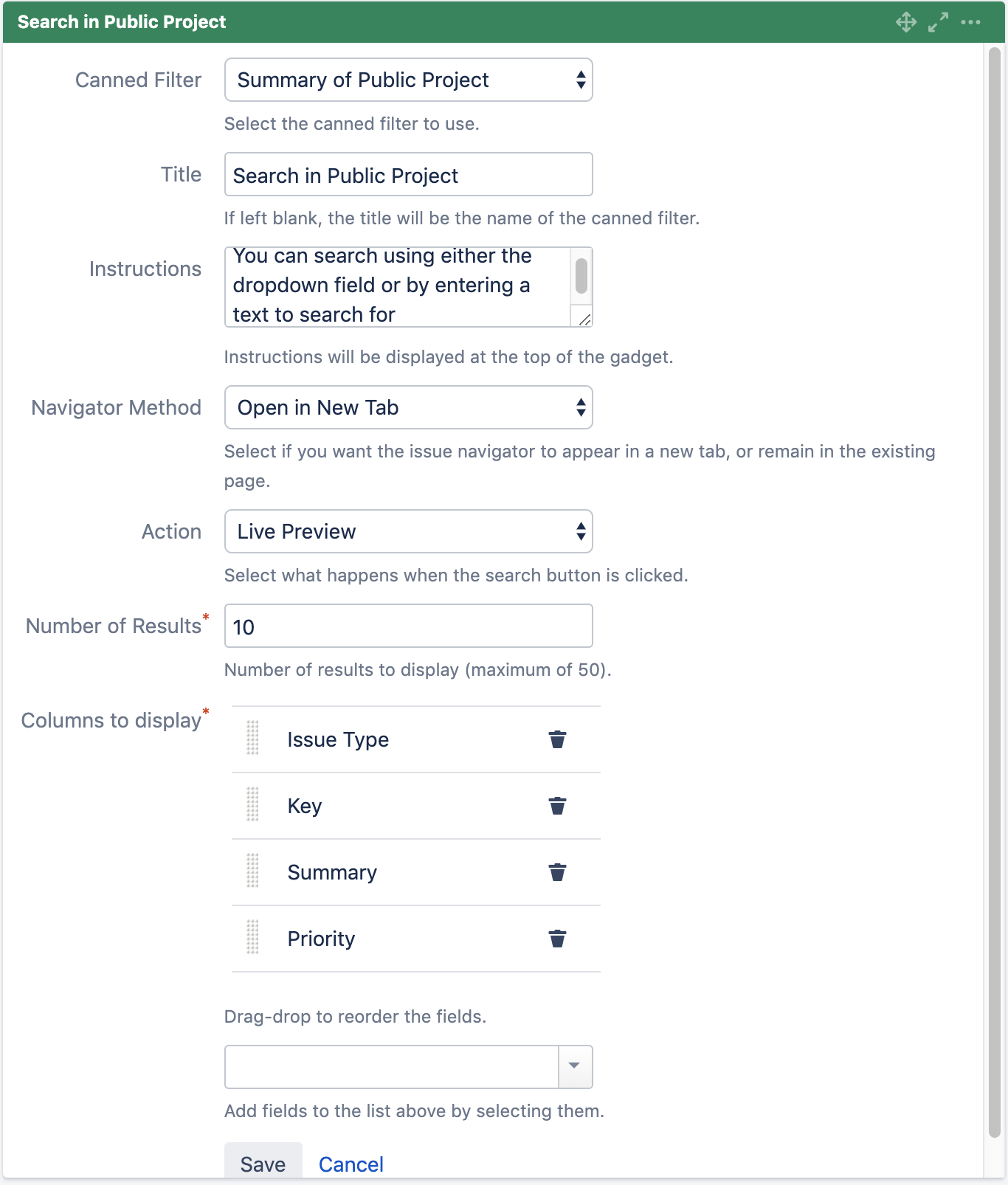 - Configure the Canned Search Gadget by filling in the configuration as below
