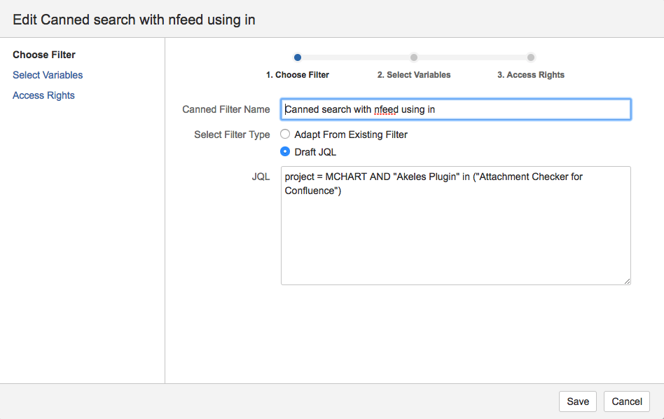 project = MCHART AND "Akeles Plugin" = "Multiple Filters Chart Gadget [com.akelesconsulting.jira.plugins.MultipleChartsGadget]"