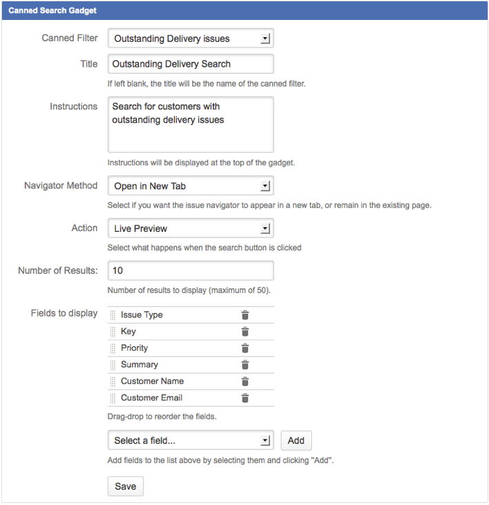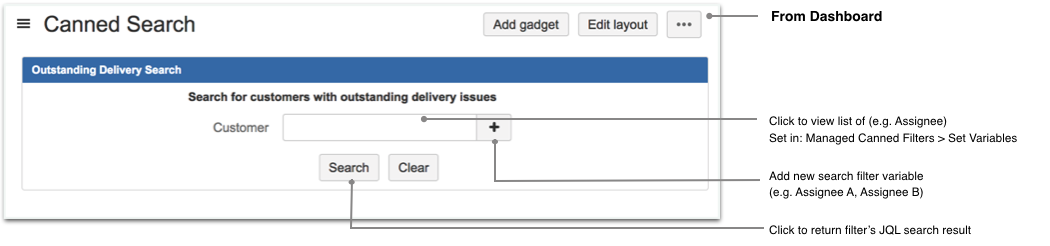 The Canned Search Gadget is designed to empower Jira users to search for issues quickly without the need to re-enter all the same criteria again every time.