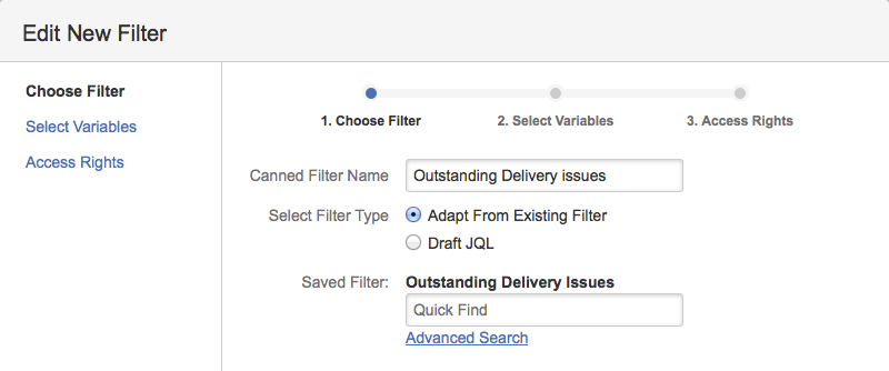 - Select the filter to be adapted from (e.g. Outstanding Delivery Issues). It is also possible to draft the JQL directly too