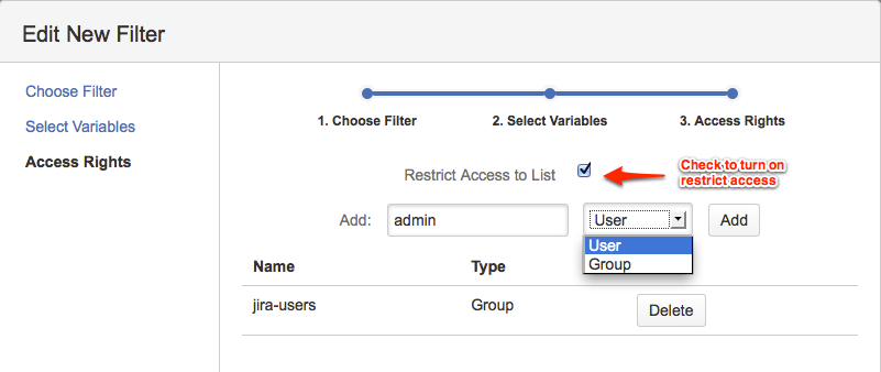 - You can configure which user or groups will be able to use that Canned Filter. Remember to check the Restrict Access to List box if you want to restrict viewing.