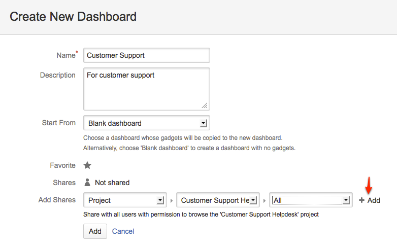 If you want to limit access of this dashboard to the Customer Support Helpdesk, rememember to click on the + Add button indicated by the red arrow