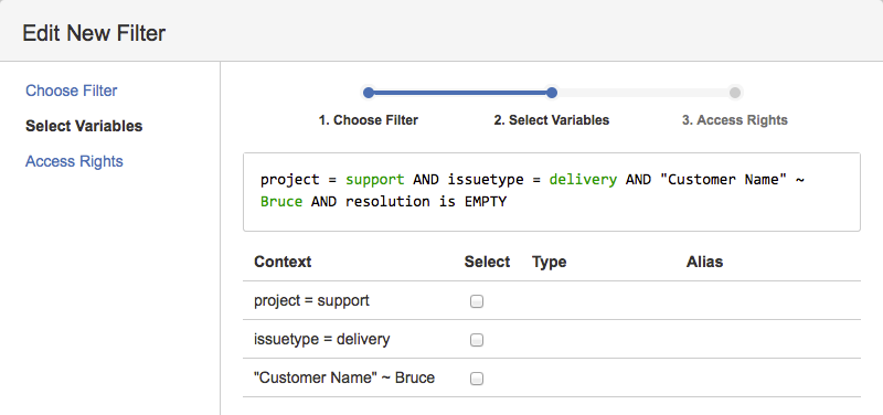 CODEproject = support and issuetype = delivery and "Customer Name" ~ "Bruce" and resolution is empty- Let's called this saved filter as Outstanding Delivery Issues