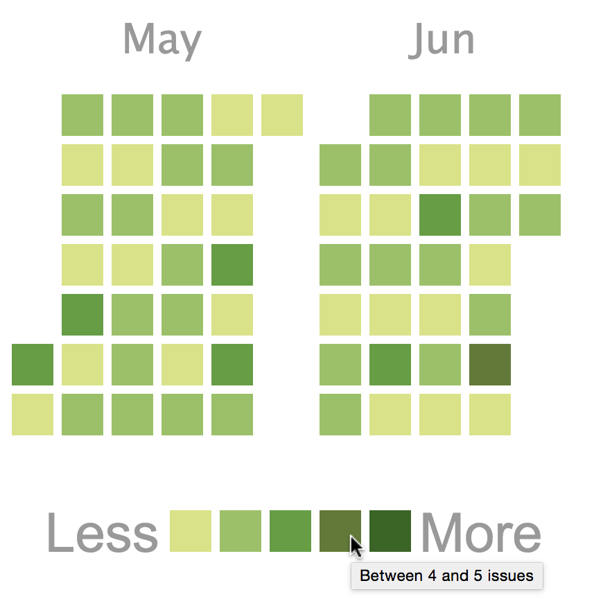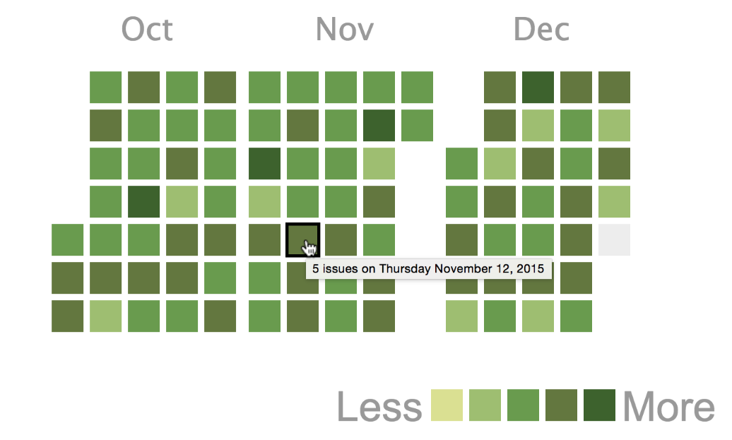 The Calendar Heatmap Gadget provides a visual overview of the number of issues on each day within a 12 month period.