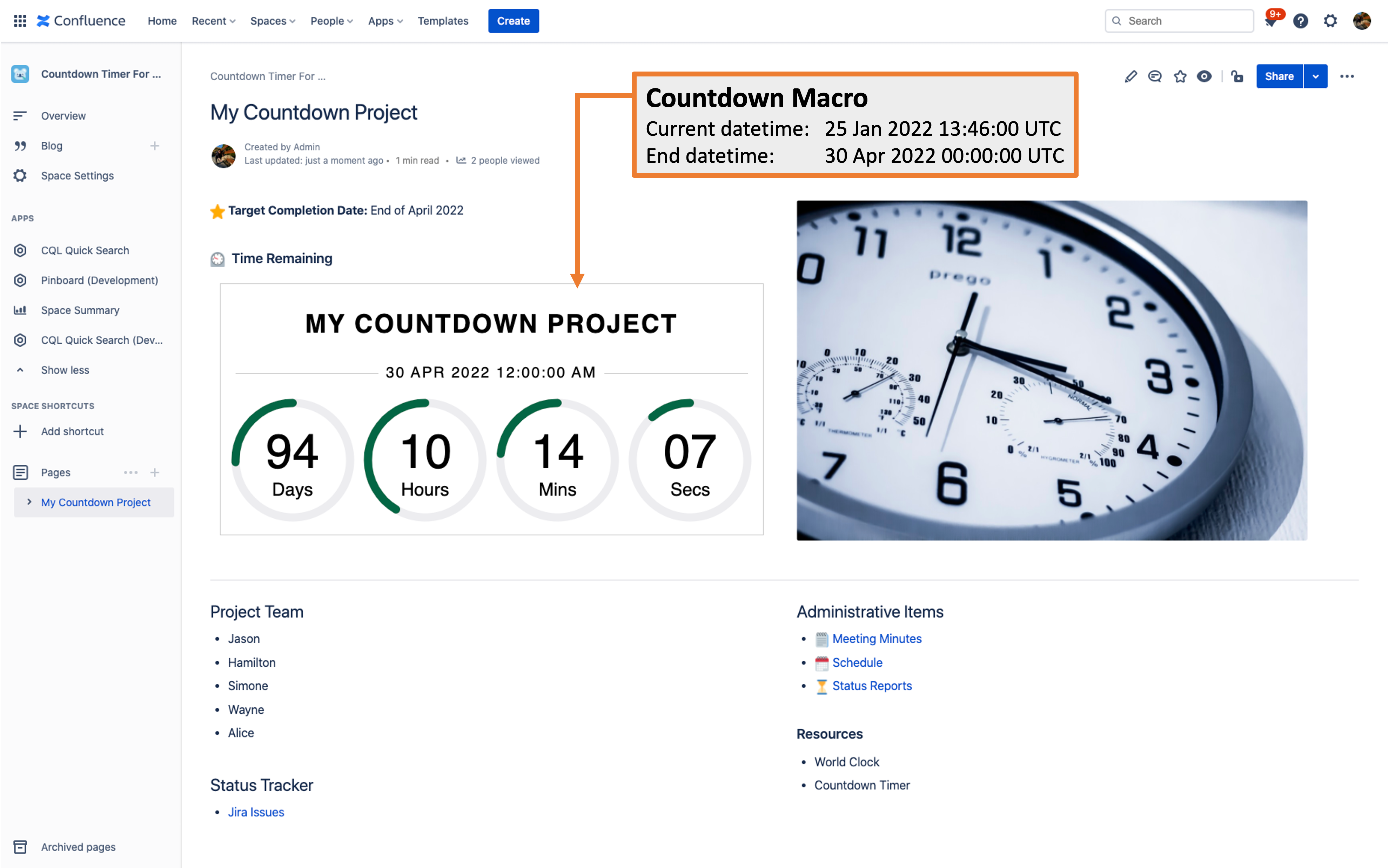 The Countdown for Confluence macro allows users to quickly know the time remaining to a particular deadline.