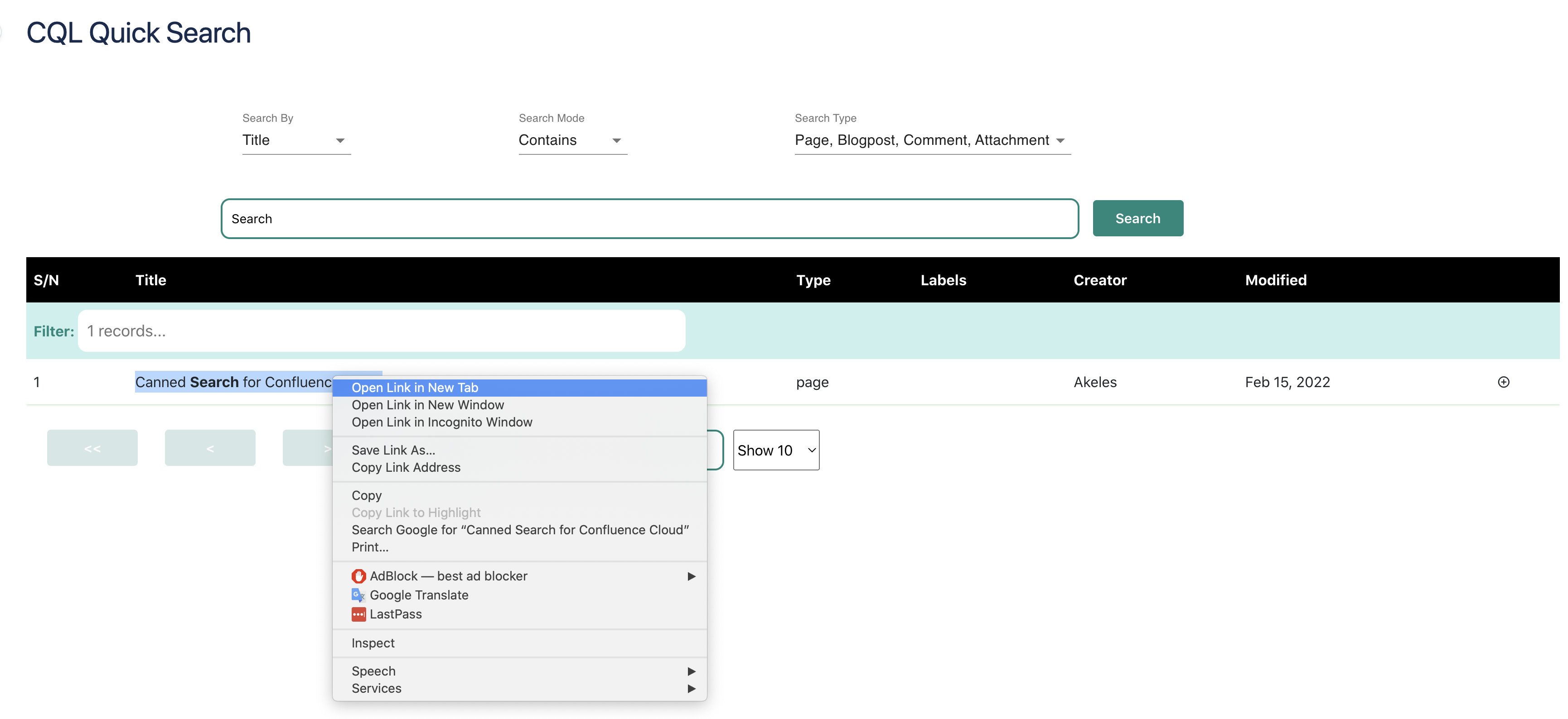 Now, you can right click on the search result and choose to open the page in a new tab in CQL Quick Search page.
