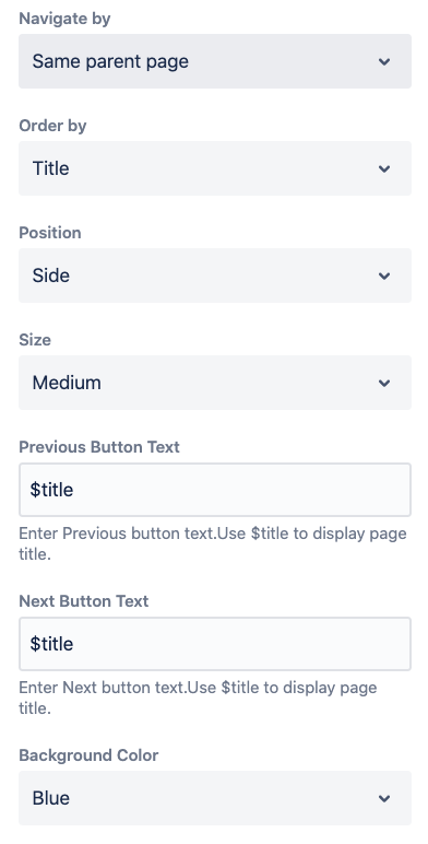 | Previous | Enter Previous button text. Use $title to display page title. |
