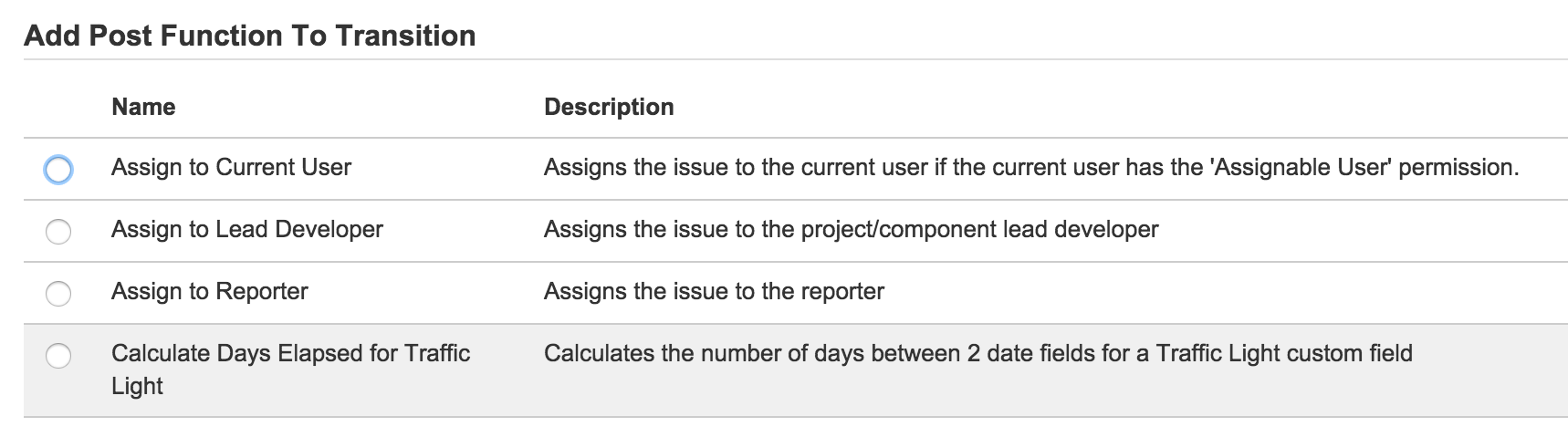- When the post function is added in the Create transition, the Traffic Light post function needs to be placed before the "Creates the issue originally." post function for it to work.