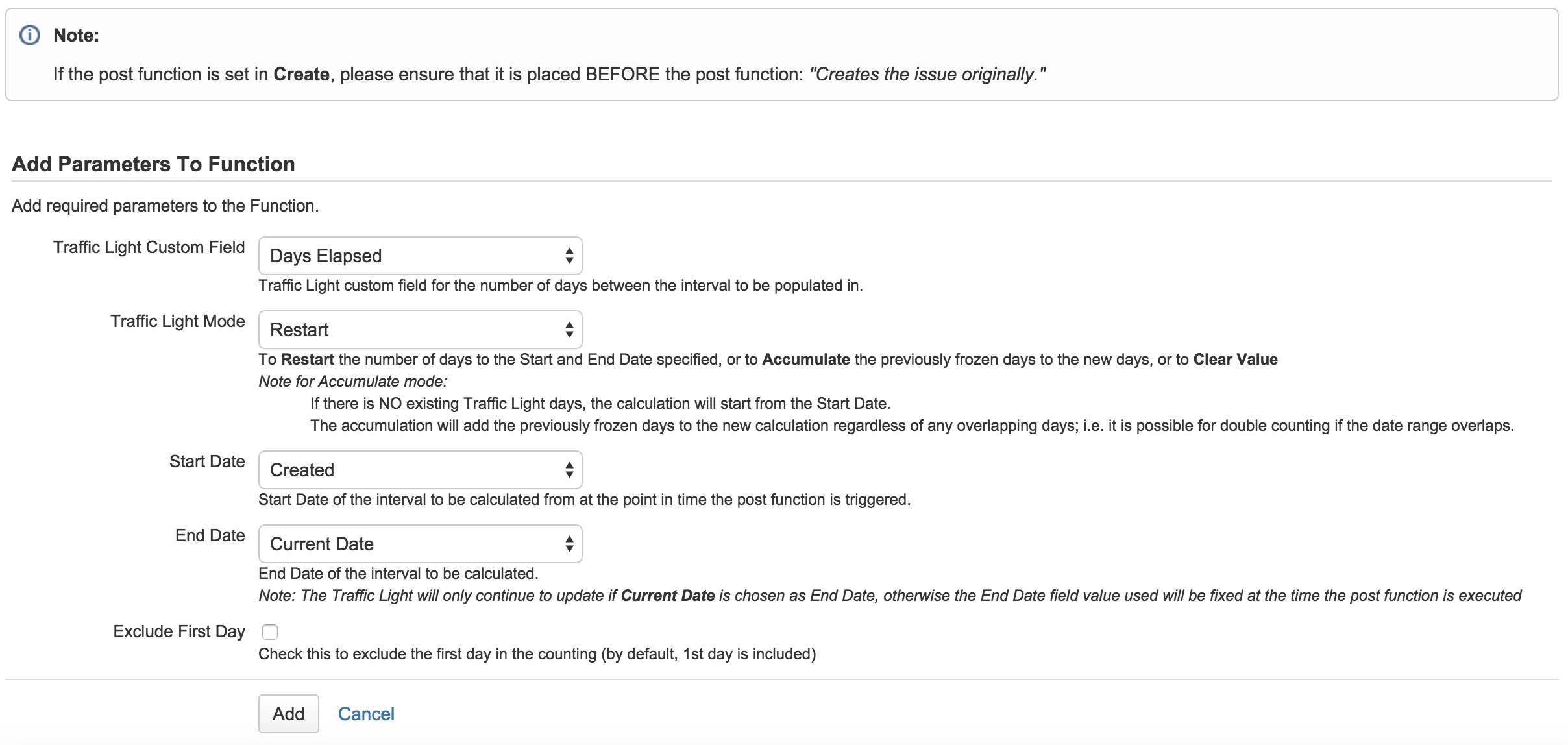 - If either the Start or End date fields is updated by the post function, please ensure that the Calculate Days Elapsed for Traffic Light post function is after the update date field post function.