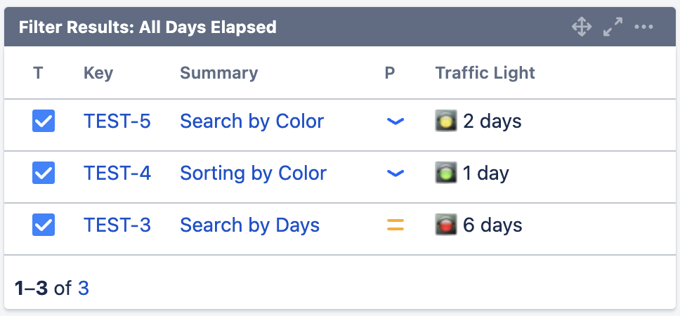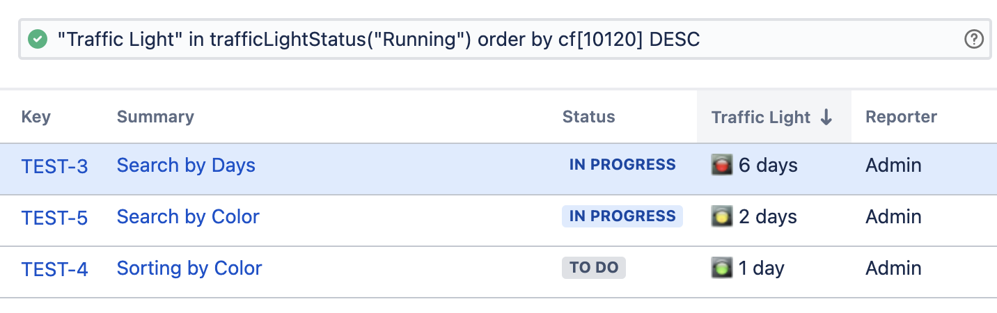 - The Traffic Light field is searchable by status using JQL function: in trafficLightStatus("Running"), in trafficLightStatus("Stopped")