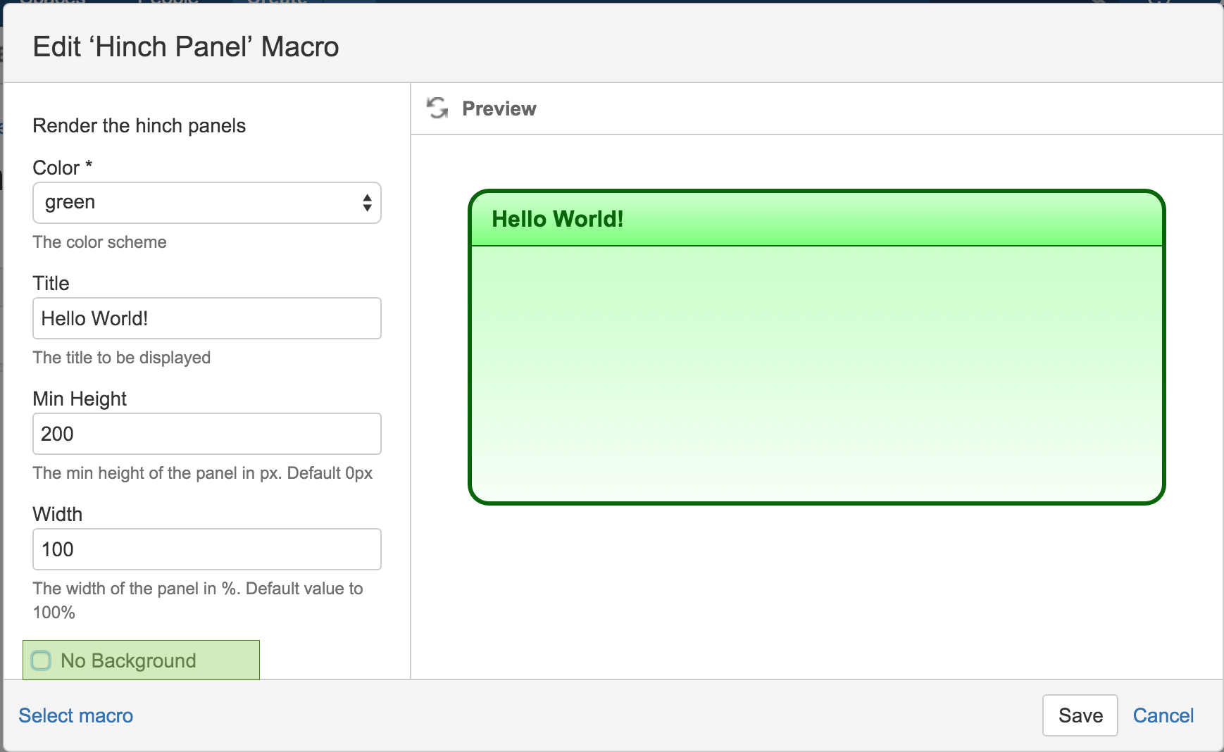 The Hinch Panels plugin is a Confluence macro that display a panel box with a gradient background for users to put in content.