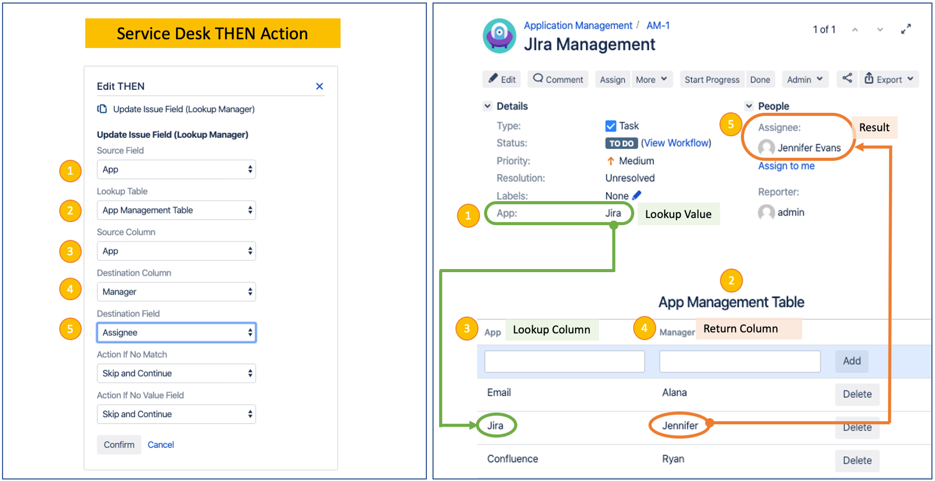 The Lookup Manager use the value in the App field, get the App Management Table to search the App column. If there is a matching row, get the value in the Manager column and then set it in the Assignee field.