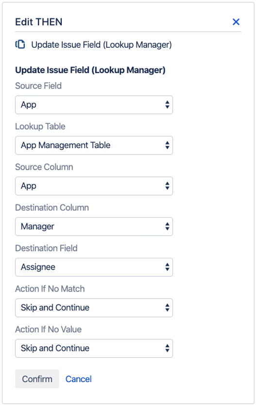 3. After added a Trigger, Select 'Update Issue Field(Lookup Manager)' option when setting up the THEN of a rule.