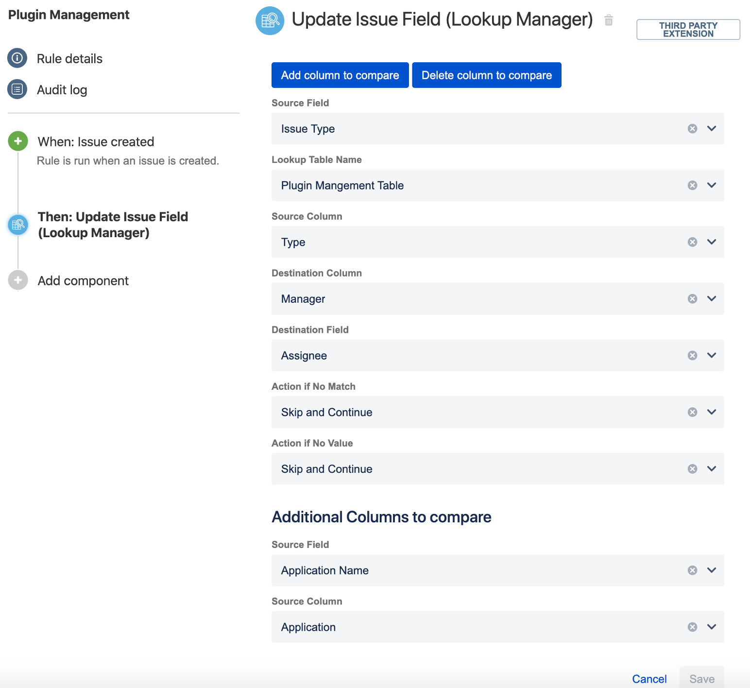 The Lookup Manager will compare the value of two issue fields with two columns from Plugin Management Table: