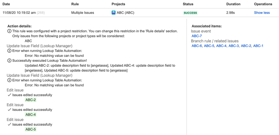 For example, the user expects the Assignee fields for the six issues to be updated. However, only three issues with matching values continue the automation rule, and the other issues stopped the execution.