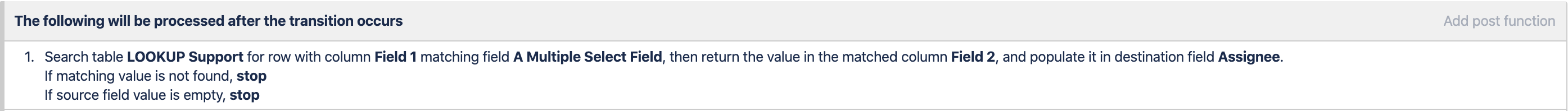 - Stop the workflow transition if the source field's value is not located in the Lookup table.