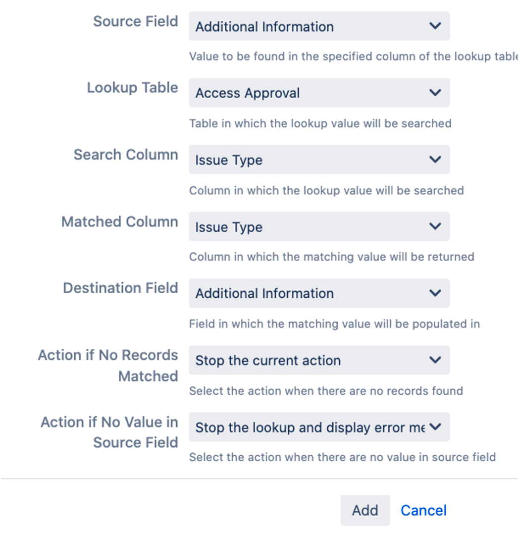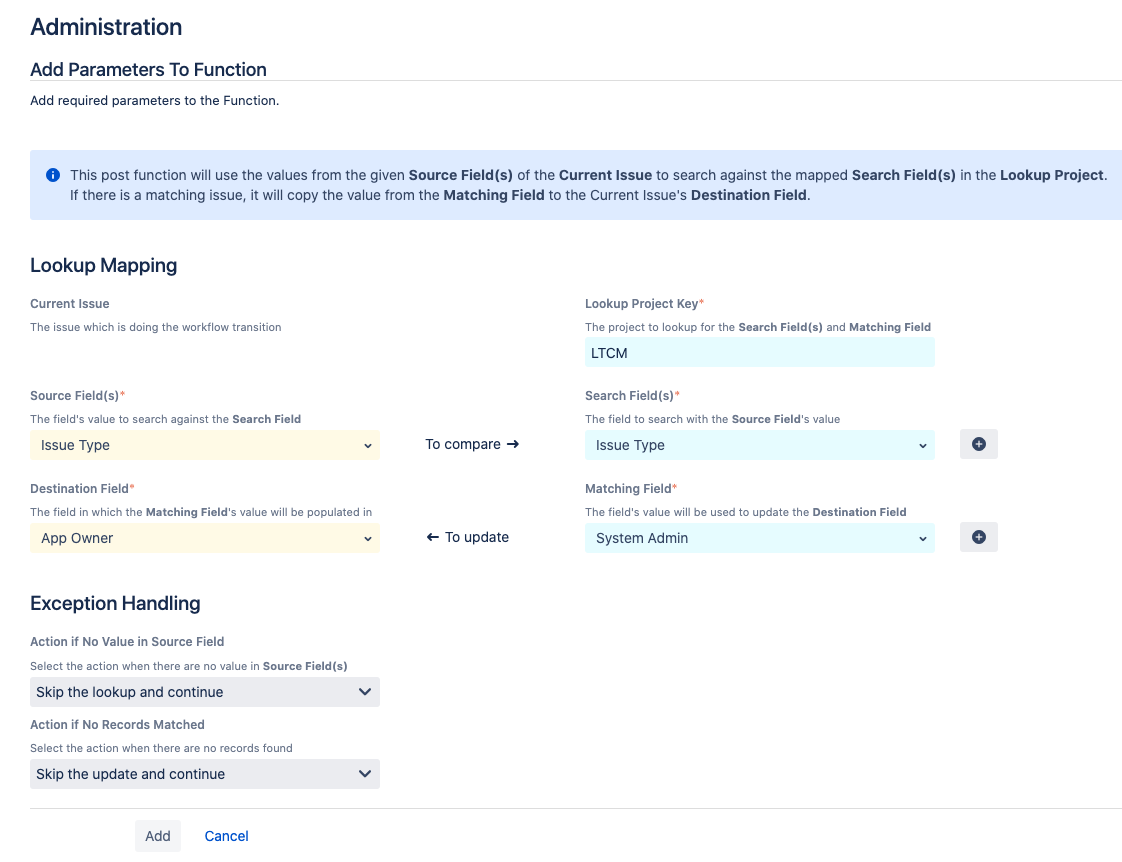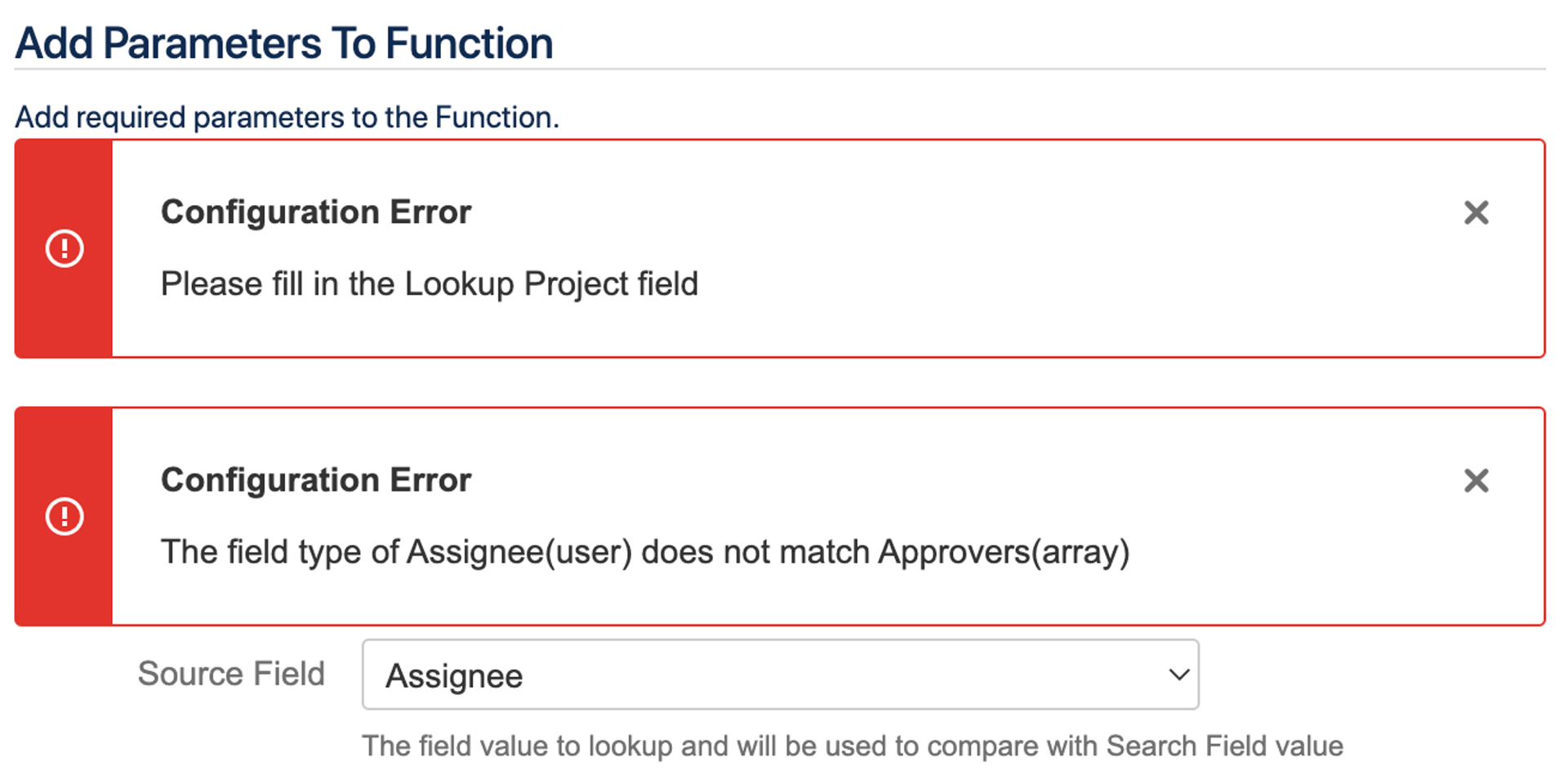 No restriction on field type | When editing post function form, there is no restriction on field type | The Source Field must be the same field type as Search Field The Matched Field must be the same field type as Destination Field |