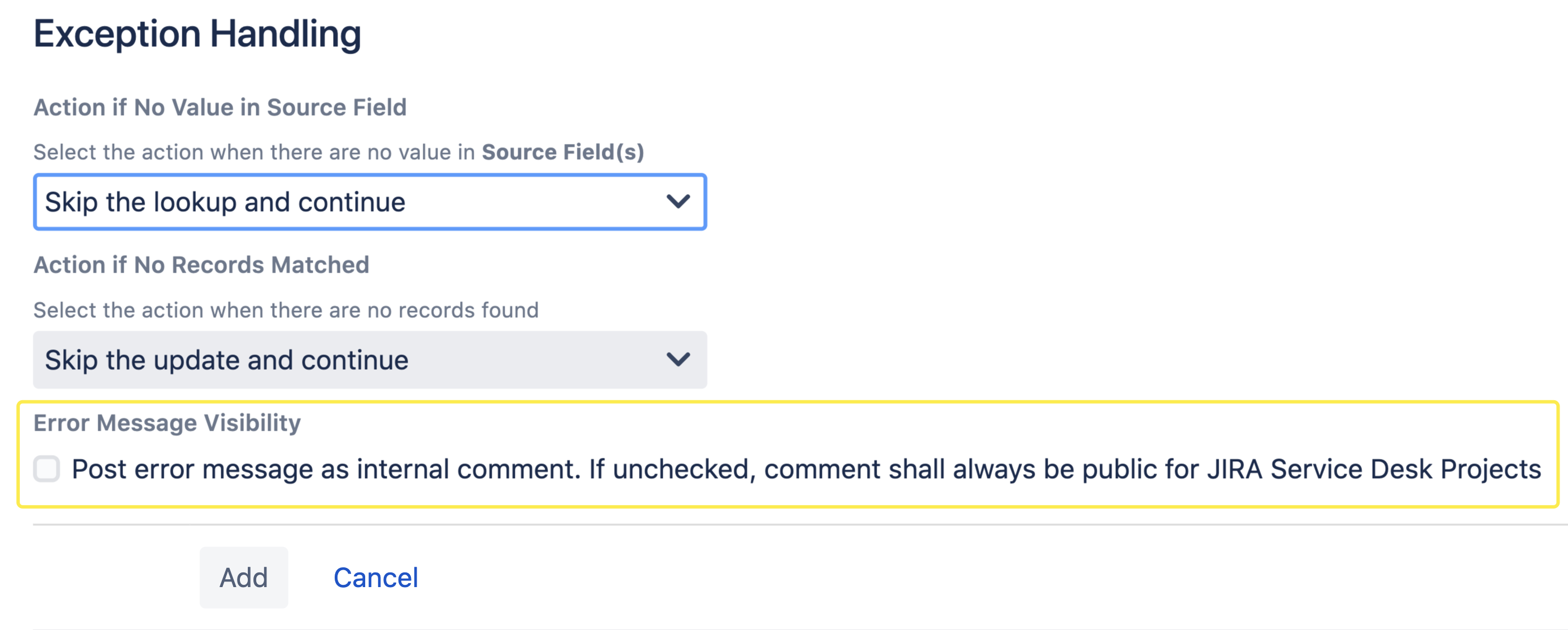 For the Service Desk projects, you can now choose to post the error message as an internal comment.