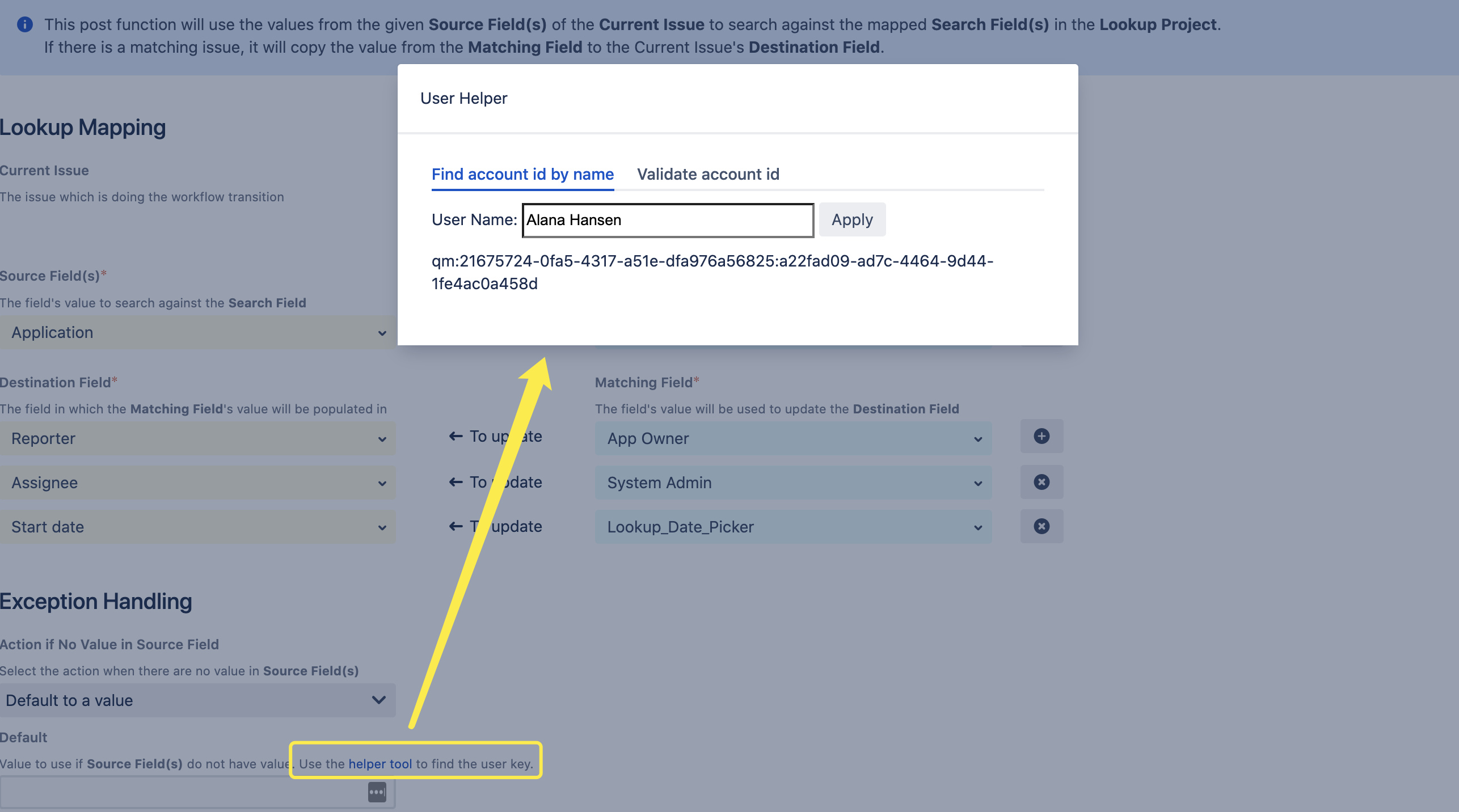 The default value for User Type requires the accountId. To help those who do not know where and how to get it, you can use the User Helper to find the account id by name.