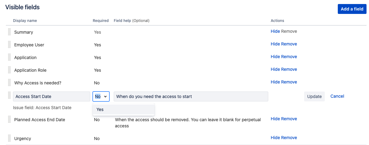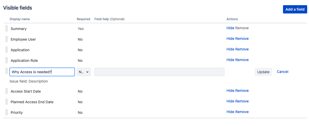 Click on the Field help (Optional) column for the Access Start Date row to enter the text When do you need the access to start and click on the Update button