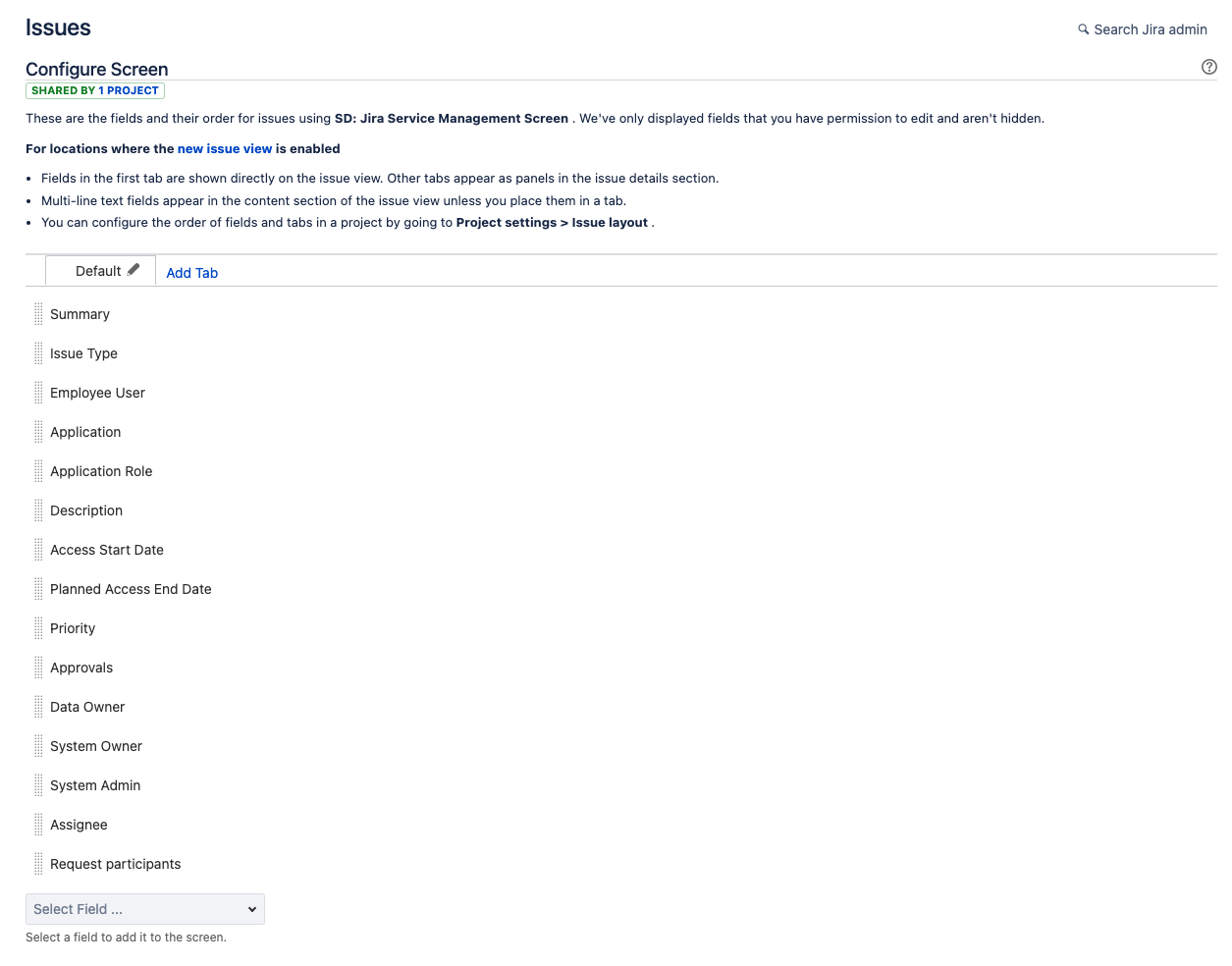 Click on SD: Jira Service Management Screen link to display the fields in the screen