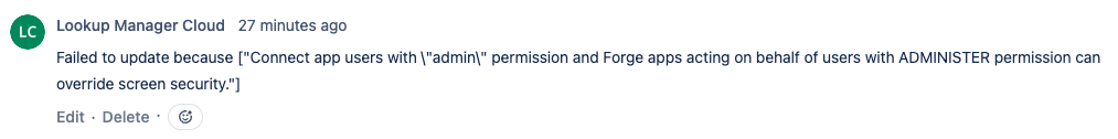 Why do I receive Failed to update because ["Connect app users with \"admin\" permission and Forge apps acting on behalf of users with ADMINISTER permission can override screen security."]