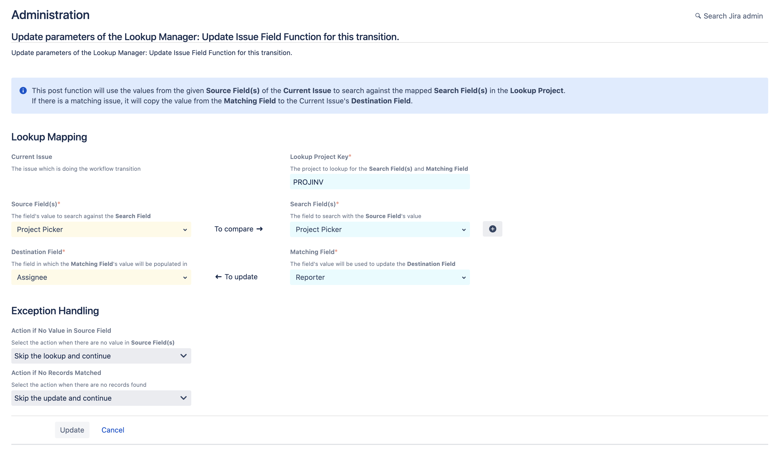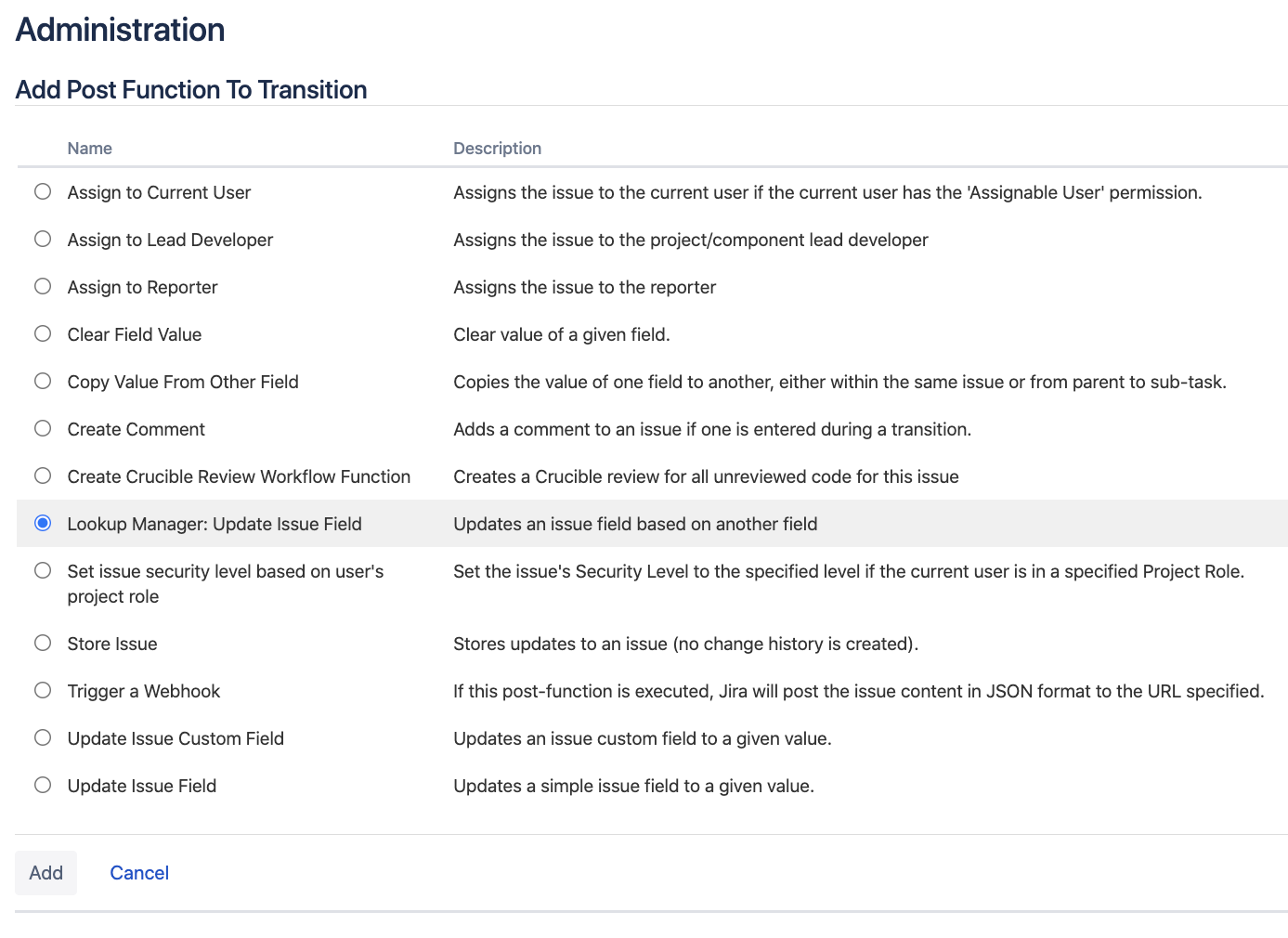 Select Lookup Manager: Update Issue Field to perform a lookup during issue transition
