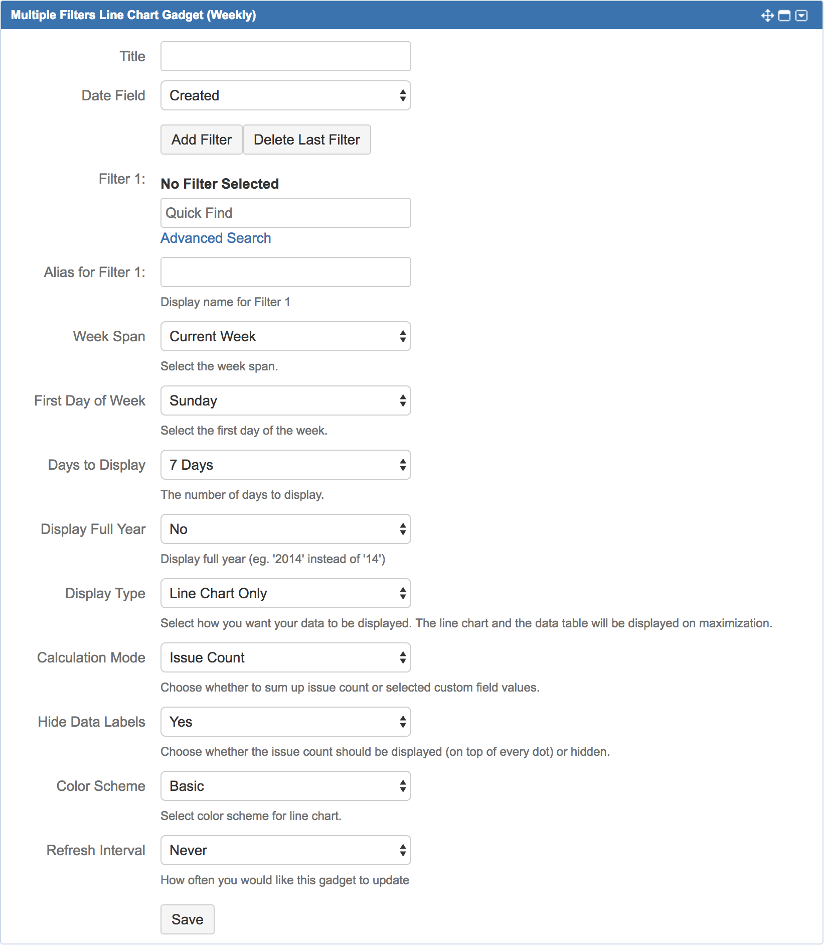 | Date Field | Created | Select the Issue Field (of Date Type) to plot as the X-axis of the line chart. |