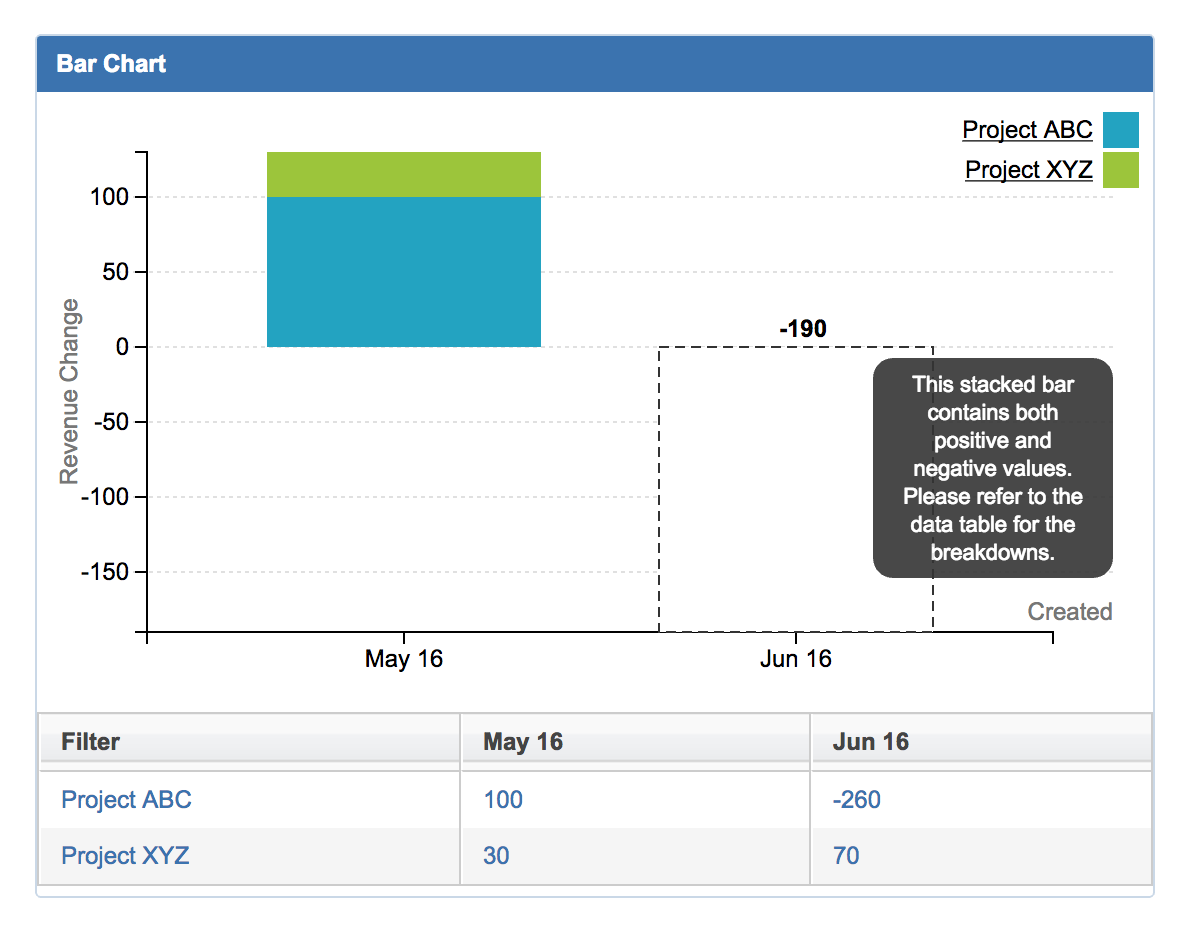 If a stacked bar contains both positive and negative values, the bar will display the final value after subtracting the negative values.