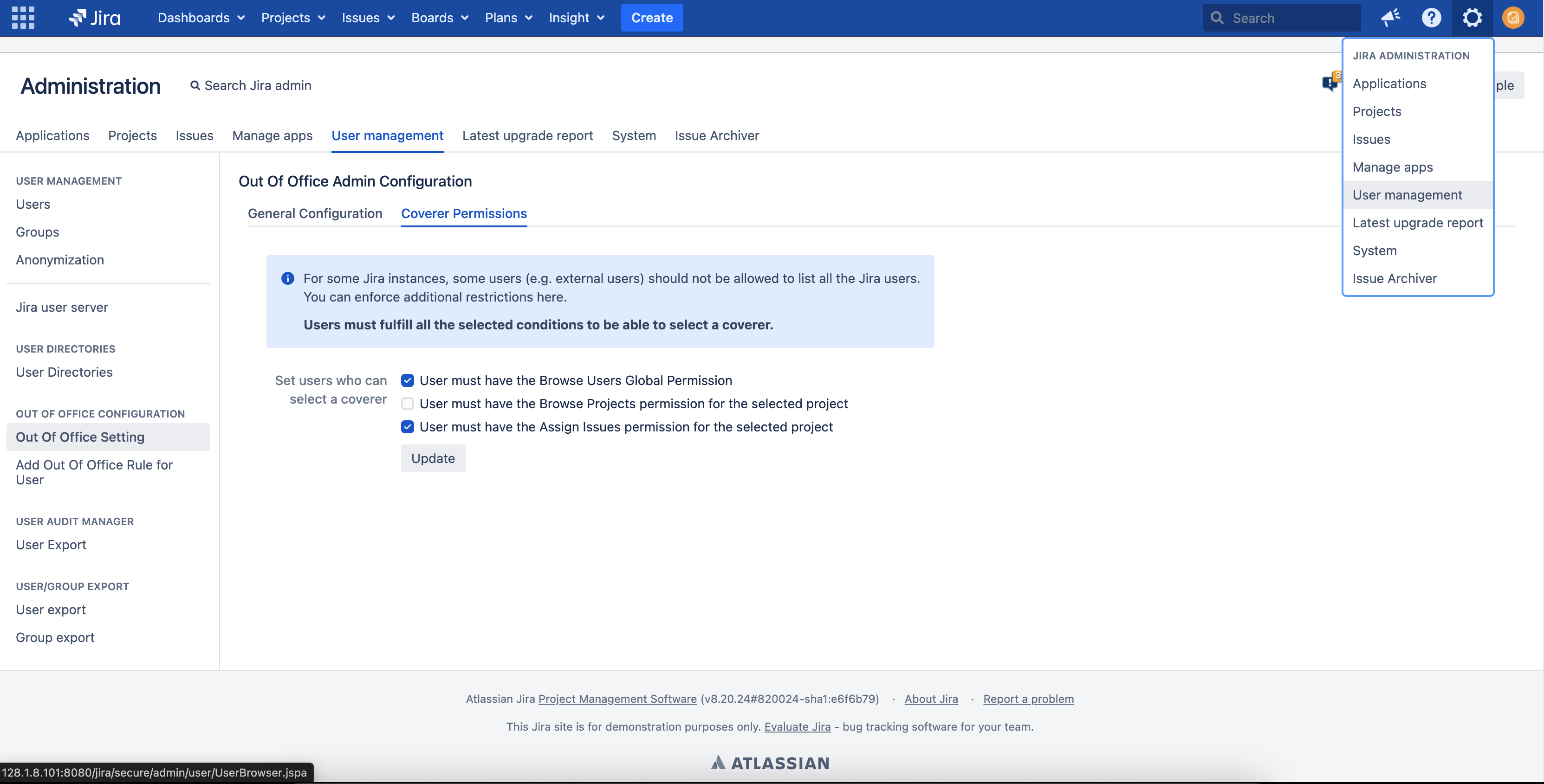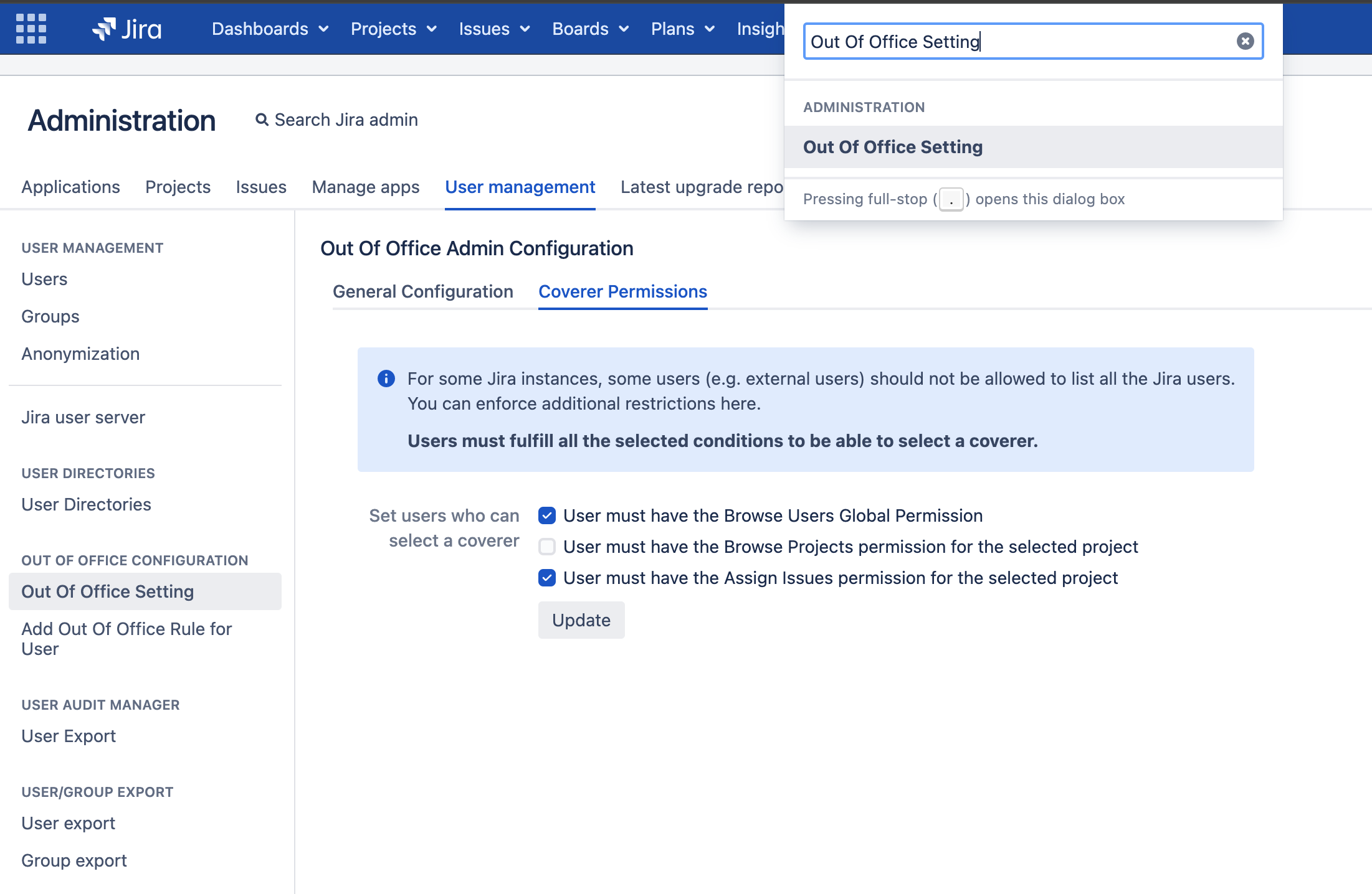 As an administrator, you may want to restrict your users from selecting / finding a coverer. In certain instances, some users (e.g. external users) should not be allowed to list all the Jira users.