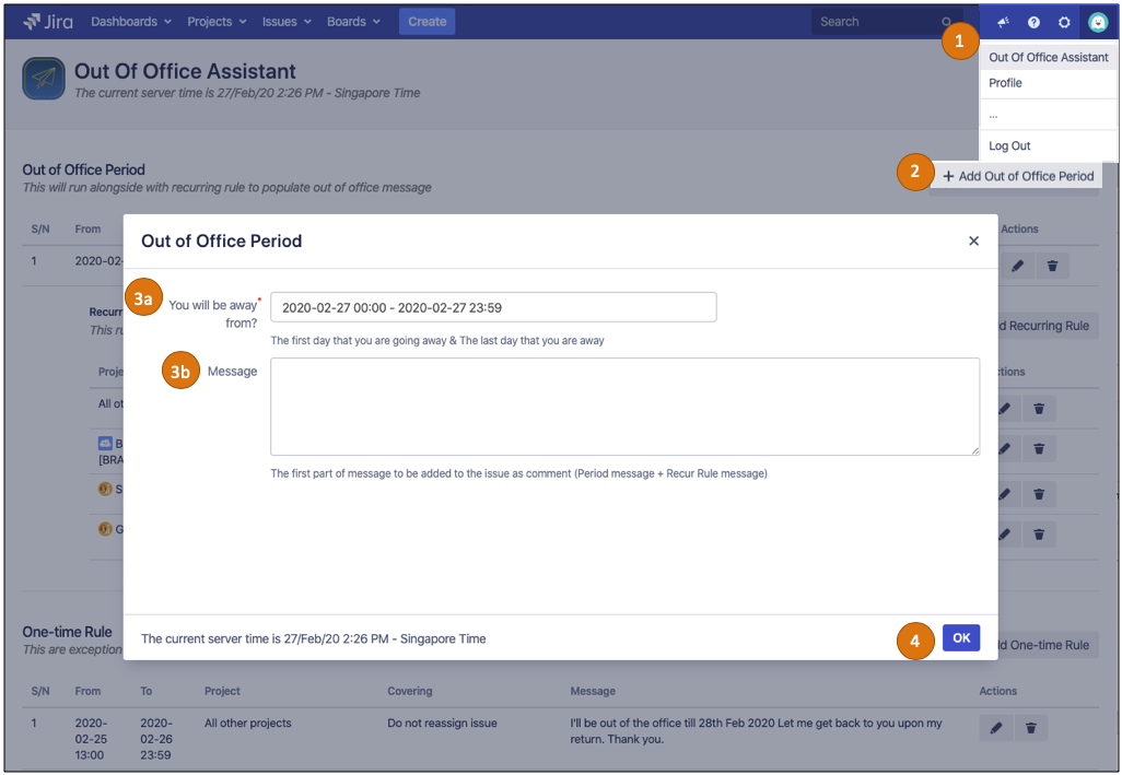 The Out-of-Office Assistant can be accessed from the user profile menu after logging into Jira.