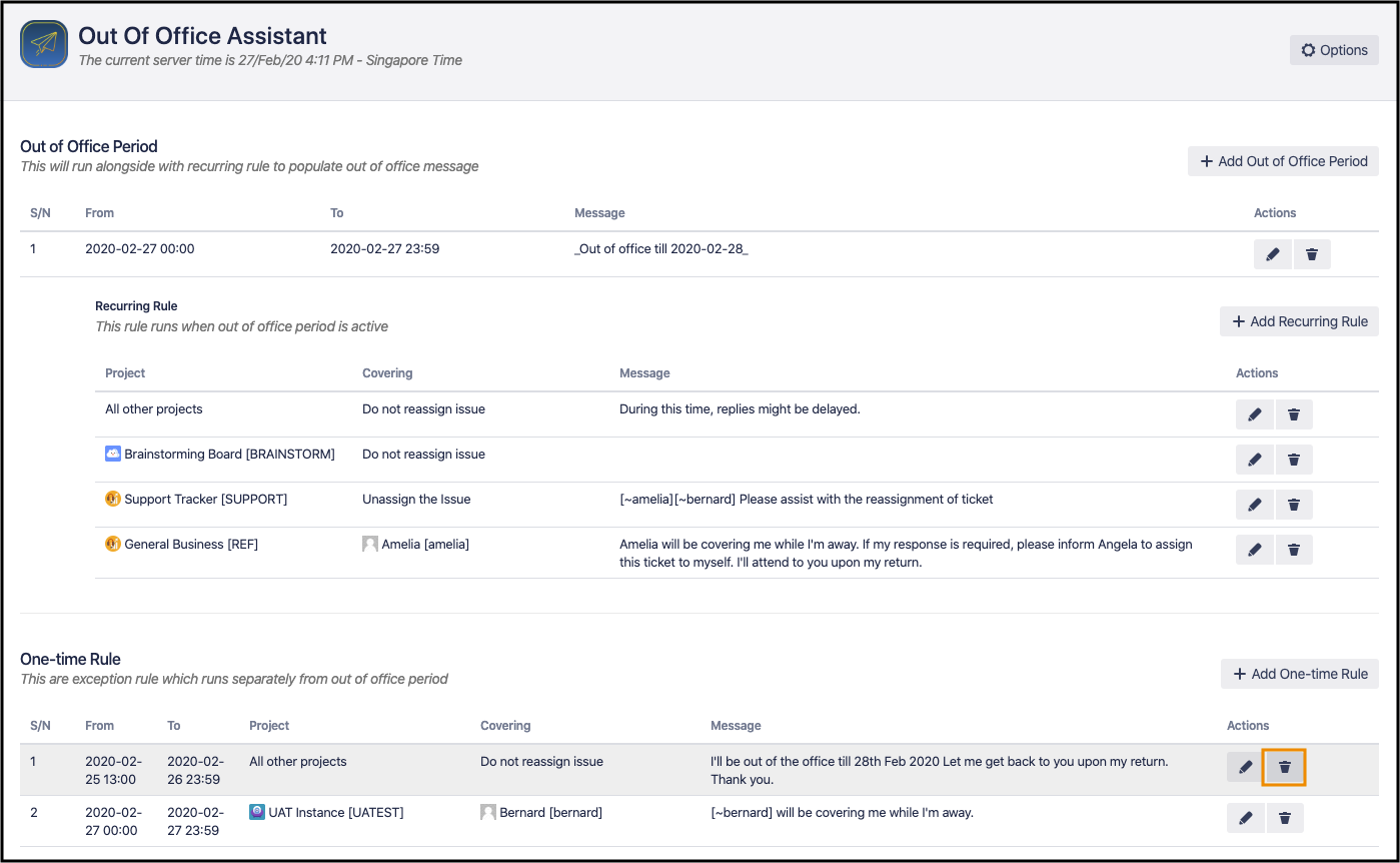 Most of the time, the reassignment rules are the same. Thus we added recurring rules which will be applicable during your out of office period. Now you only need to specify the period you are out of office.