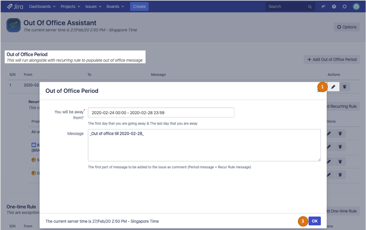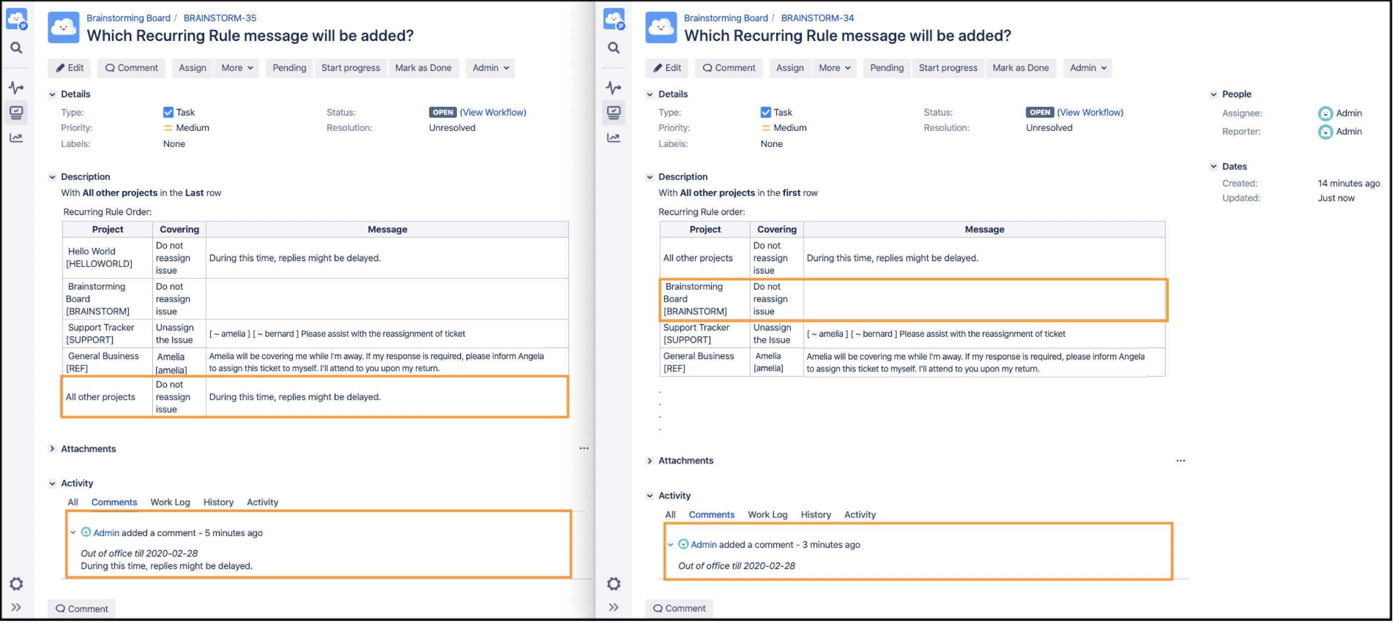 Both the messages in the Out of Office Period and Recurring Rule will be added in the comment.