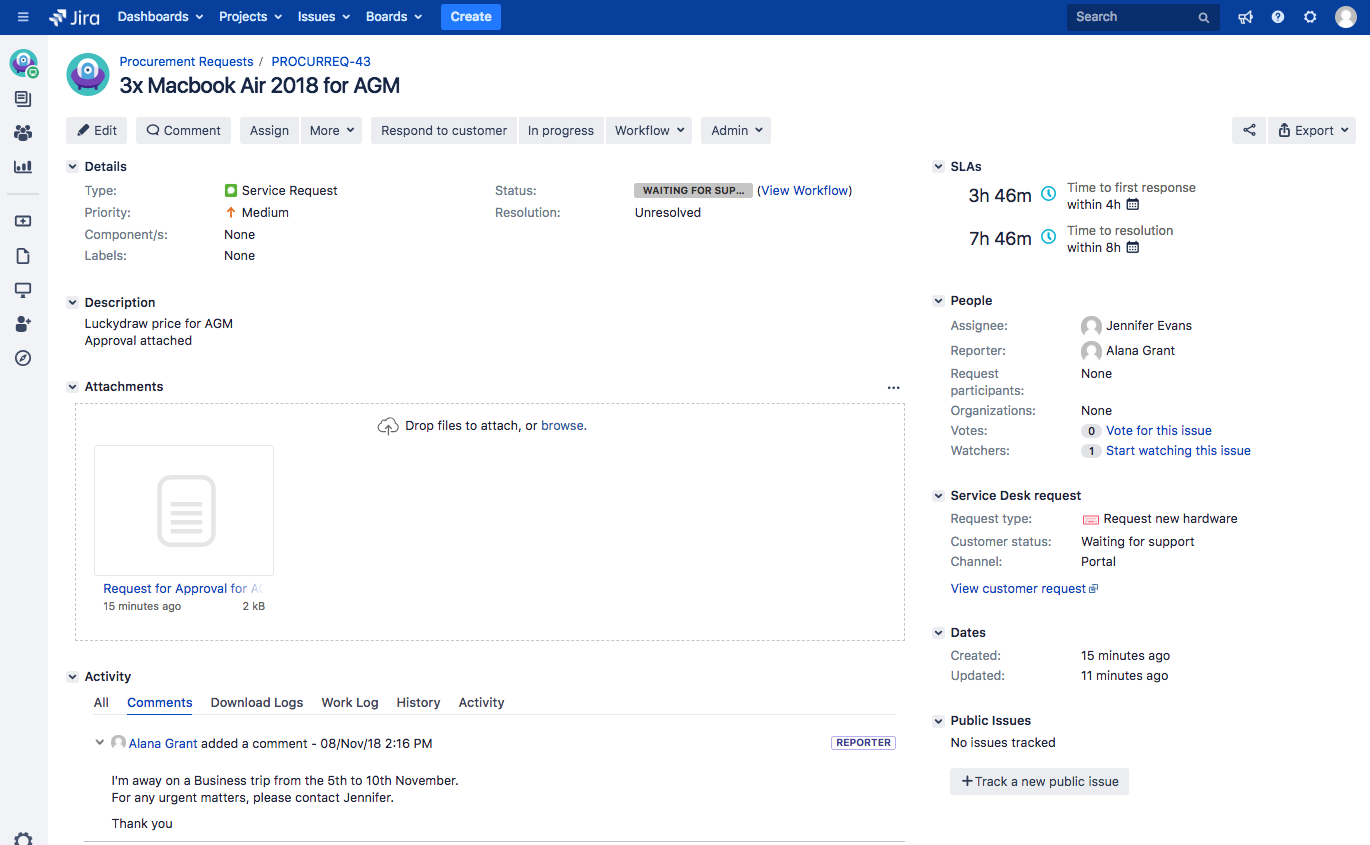 Now you only need to specify the period you are out of office. There is no need to refill in all the settings. Both the messages in the Out of Office Period and Recurring Rule will be added in the comment.