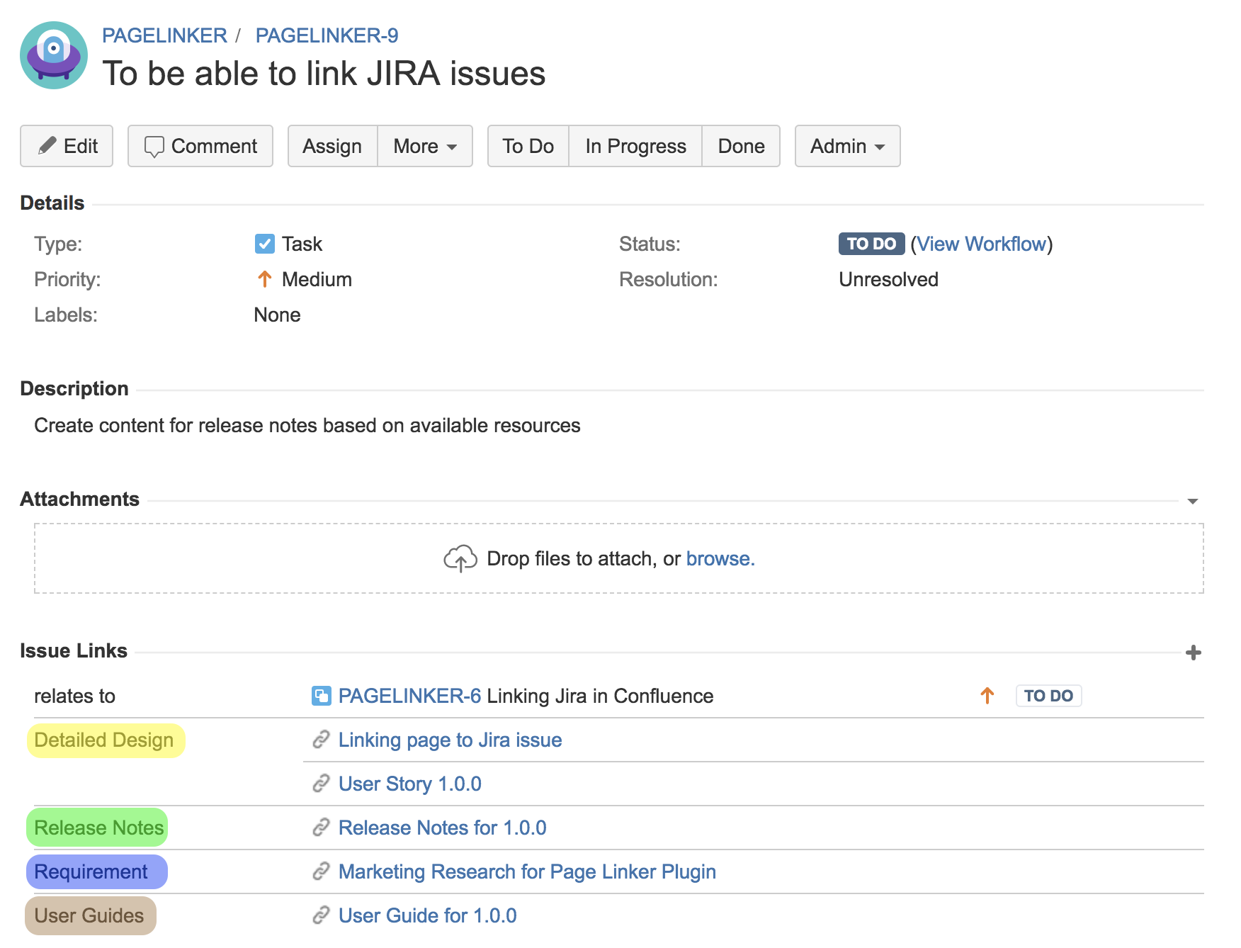 The Page Linker for Confluence allows users to define different types of links between Confluence pages and Jira issues.