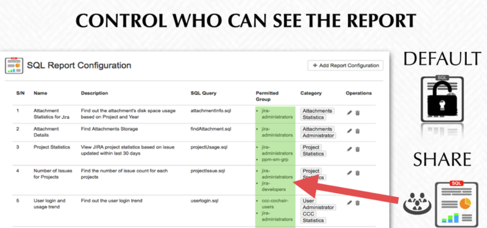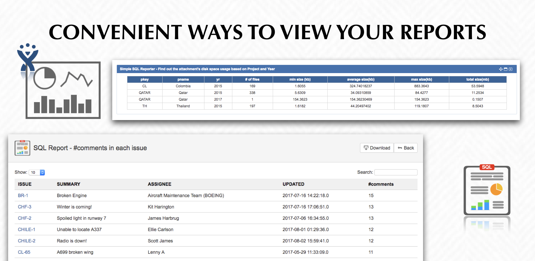 The SQL Reporter for Jira enhance your search capability in Jira. With SQL Reporter for Jira, Jira users will be able to view SQL results in data table, displaying result set into gadgets or even download or spool them into Excel files. Jira Administrator can also limit the visibility of SQL reporter based on groups.
