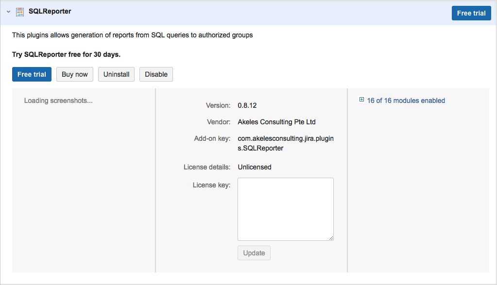 - Enter SQL Reporter for Jira in the texbox labelled with Search the Marketplace