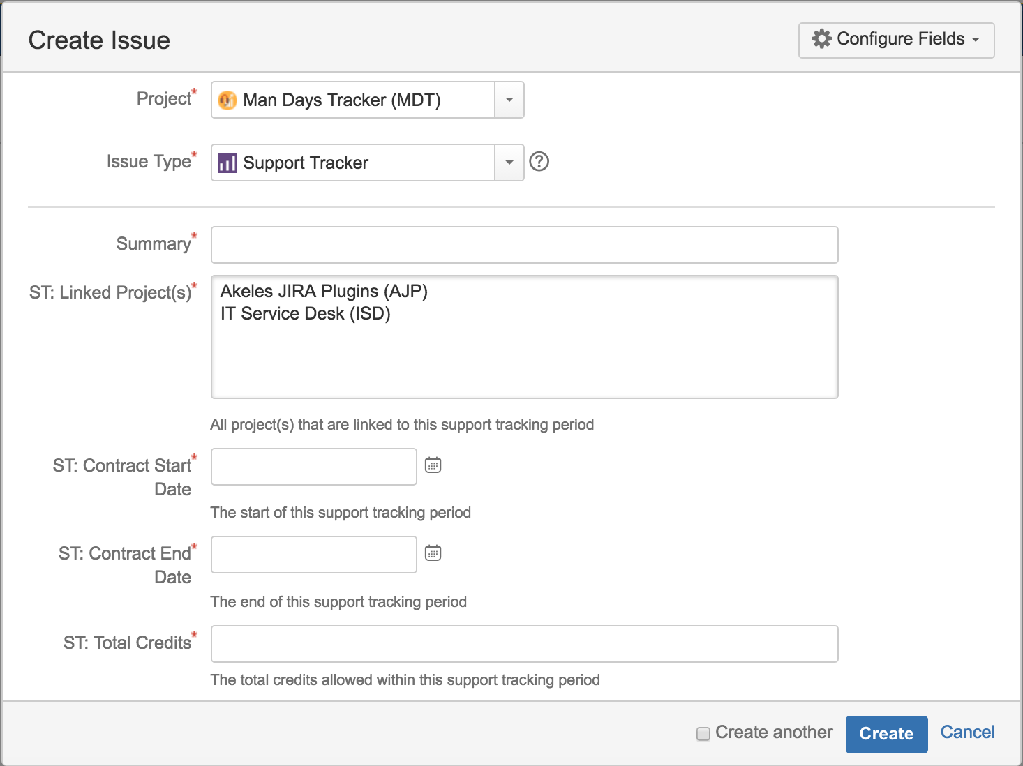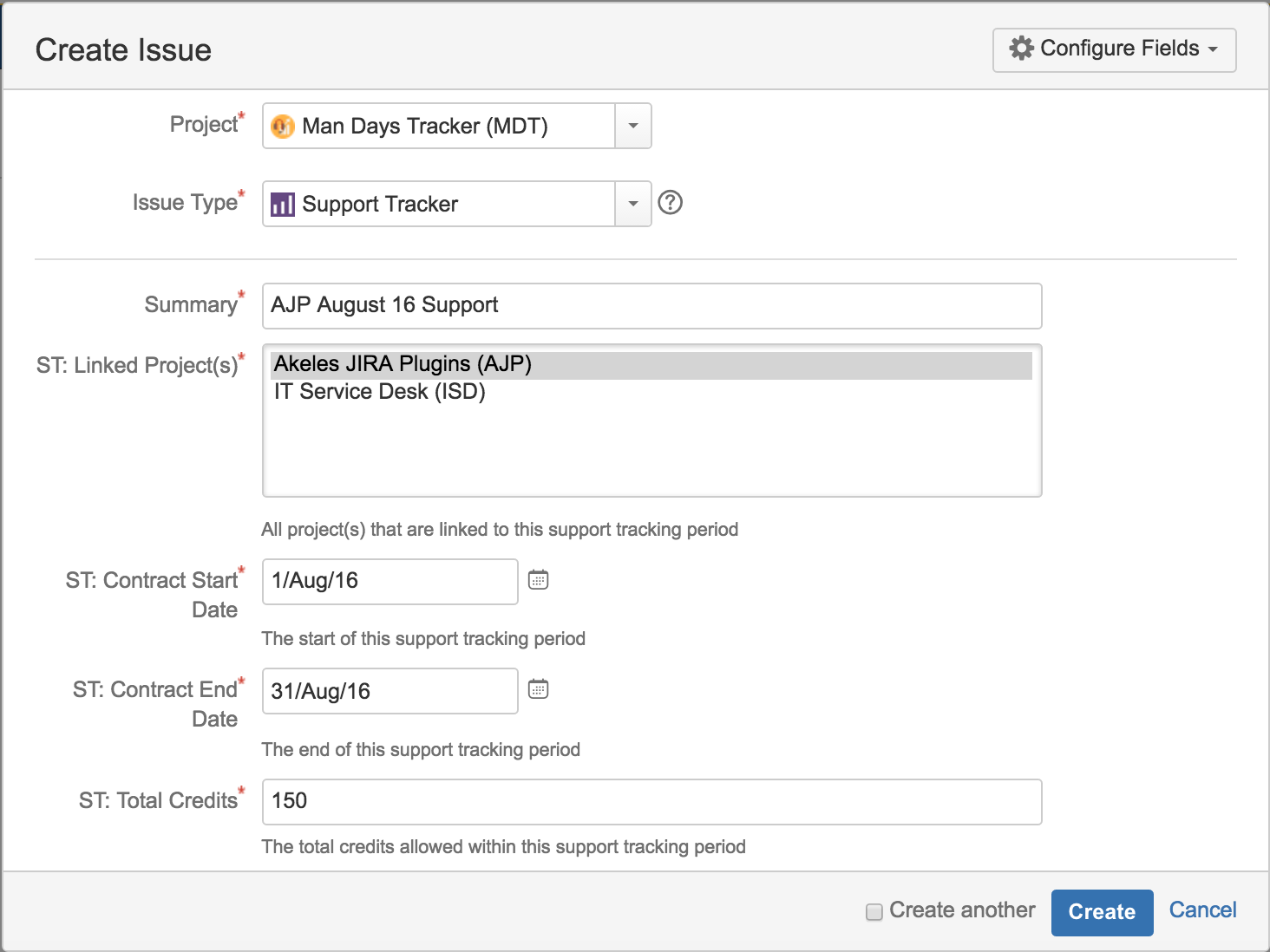e.g. If the Support Tracker Bucket only contains "Akeles Jira Plugins", and the Reference Date field set for the current project "Man Days Tracker" is "Created Date", then if ST: Contract Start Date = "1/Aug/16" and ST: Contract Start Date = "31/Aug/16", theMaintenance Period for this issue will be – all issues in "Akeles Jira Plugins" project that are created between 1/Aug/16 to 31/Aug/16ST: Contract End Date A date field that defines the end date of the support contract period ST: Total Credit A number field that allocates the total credit amount for the Maintenance Period This is the reference number used to determine if the credit utilisation has reached warning level or exceeded 100%