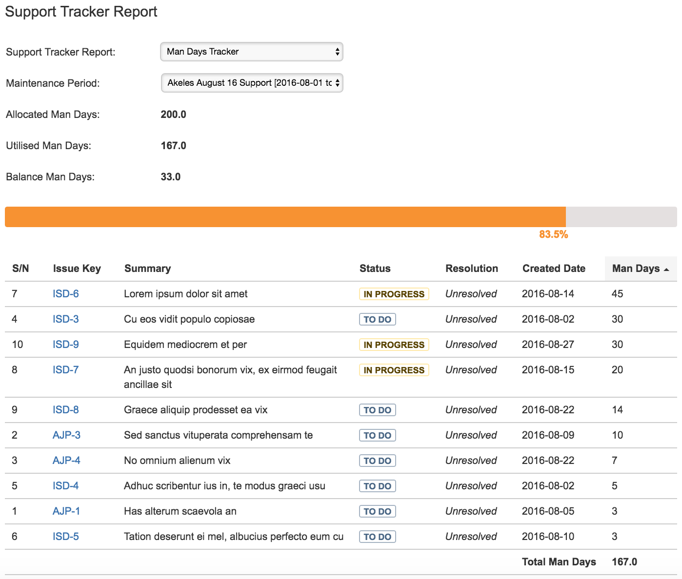 - The report will show the Support utilisation, balance, as well as issue details for all issues that contributes to the total utilisation