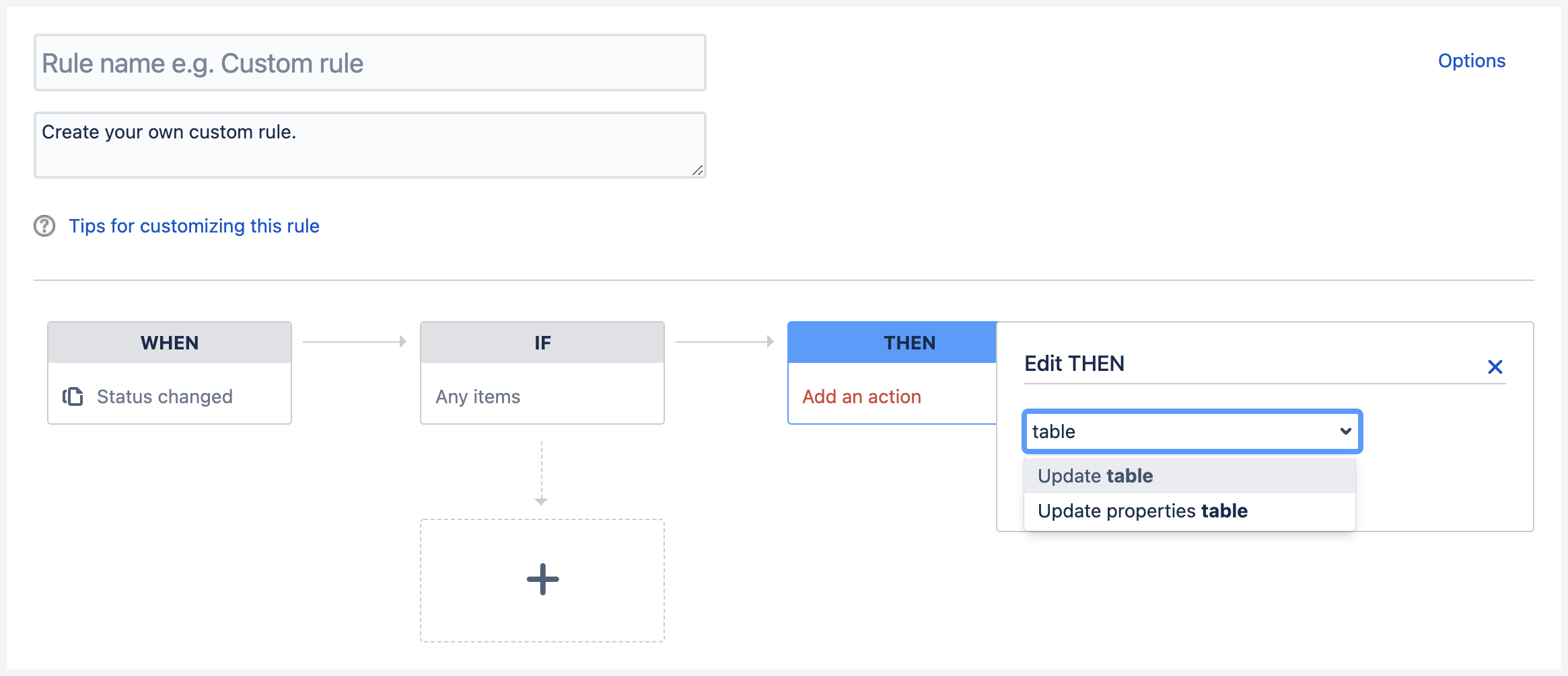 3. Add a trigger, for example, Status changed, then add an action, search for Update table or Update properties table and click 'Add'.