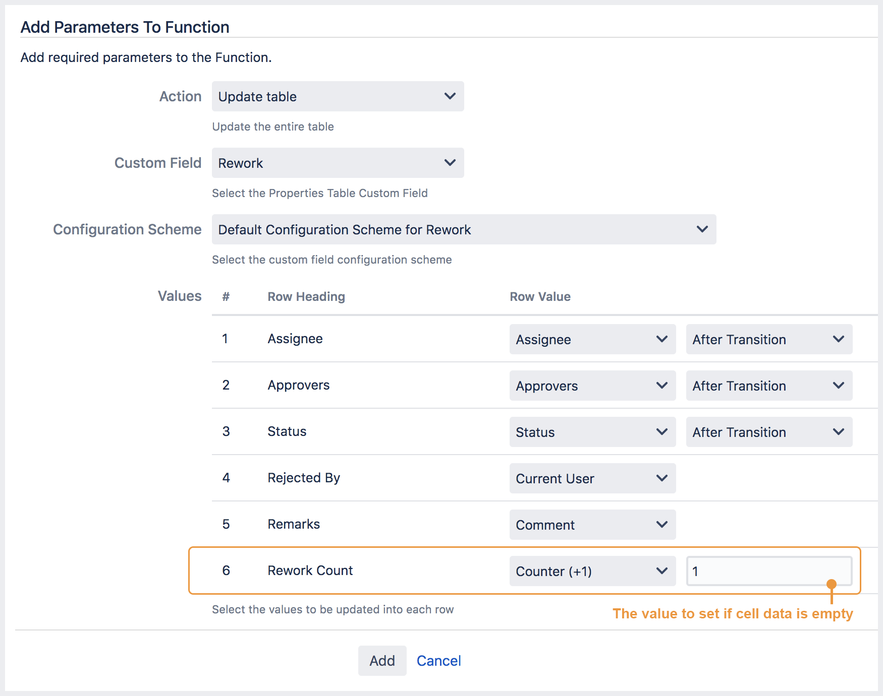 Select Counter (+1) as the value for Rework Count in the post function for Send for Rework transition.