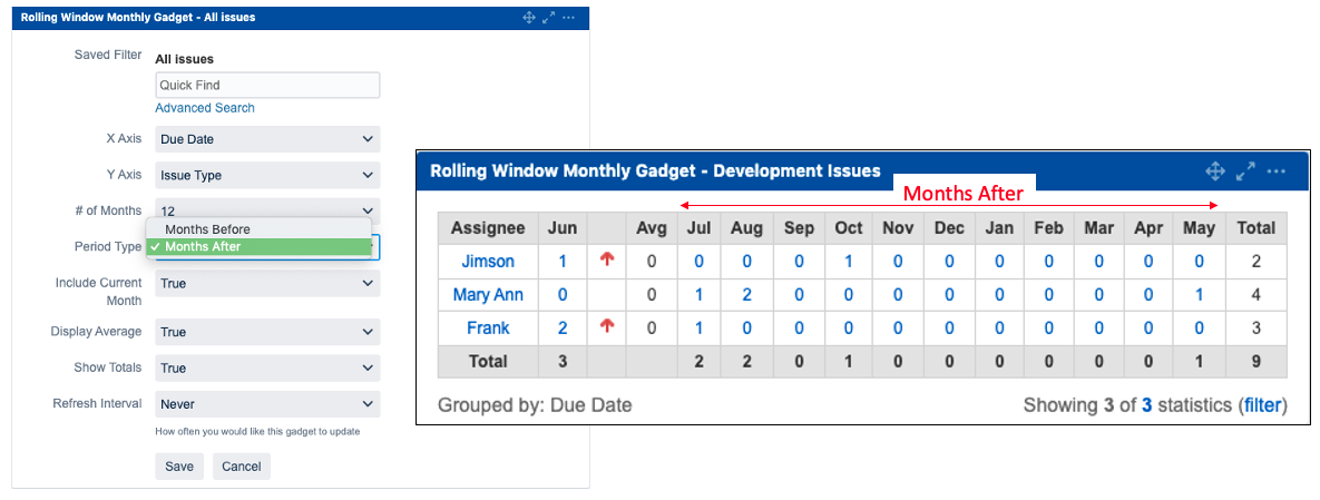 Now you can choose to look in forward (i.e select whether rolling period should be last or next x months). This feature allows users to track issues with date fields in the future (E.g. to track number of issues with due dates in the coming months).